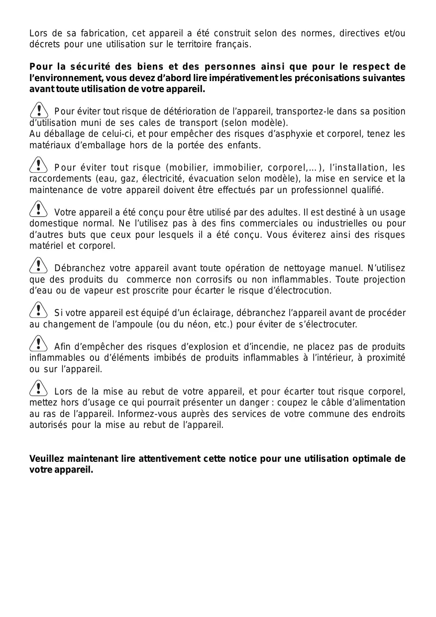 Lors de sa fabrication, cet appareil a été construit selon des normes, directives et/ou décrets pour une utilisation sur le territoire français. Pour la sécurité des biens et des personnes ainsi que pour le respect de l’environnement, vous devez d’abord lire impérativement les préconisations suivantes avant toute utilisation de votre appareil. Pour éviter tout risque de détérioration de l’appareil, transportez-le dans sa position d’utilisation muni de ses cales de transport (selon modèle). Au déballage de celui-ci, et pour empêcher des risques d’asphyxie et corporel, tenez les matériaux d’emballage hors de la portée des enfants. Pour éviter tout risque (mobilier, immobilier, corporel,…), l’installation, les raccordements (eau, gaz, électricité, évacuation selon modèle), la mise en service et la maintenance de votre appareil doivent être effectués par un professionnel qualifié. Votre appareil a été conçu pour être utilisé par des adultes. Il est destiné à un usage domestique normal. Ne l’utilisez pas à des fins commerciales ou industrielles ou pour d’autres buts que ceux pour lesquels il a été conçu. Vous éviterez ainsi des risques matériel et corporel. Débranchez votre appareil avant toute opération de nettoyage manuel. N’utilisez que des produits du commerce non corrosifs ou non inflammables. Toute projection d’eau ou de vapeur est proscrite pour écarter le risque d’électrocution. Si votre appareil est équipé d’un éclairage, débranchez l’appareil avant de procéder au changement de l’ampoule (ou du néon, etc.) pour éviter de s’électrocuter. Afin d’empêcher des risques d’explosion et d’incendie, ne placez pas de produits inflammables ou d’éléments imbibés de produits inflammables à l’intérieur, à proximité ou sur l’appareil. Lors de la mise au rebut de votre appareil, et pour écarter tout risque corporel, mettez hors d’usage ce qui pourrait présenter un danger : coupez le câble d’alimentation au ras de l’appareil. Informez-vous auprès des services de votre commune des endroits autorisés pour la mise au rebut de l’appareil.