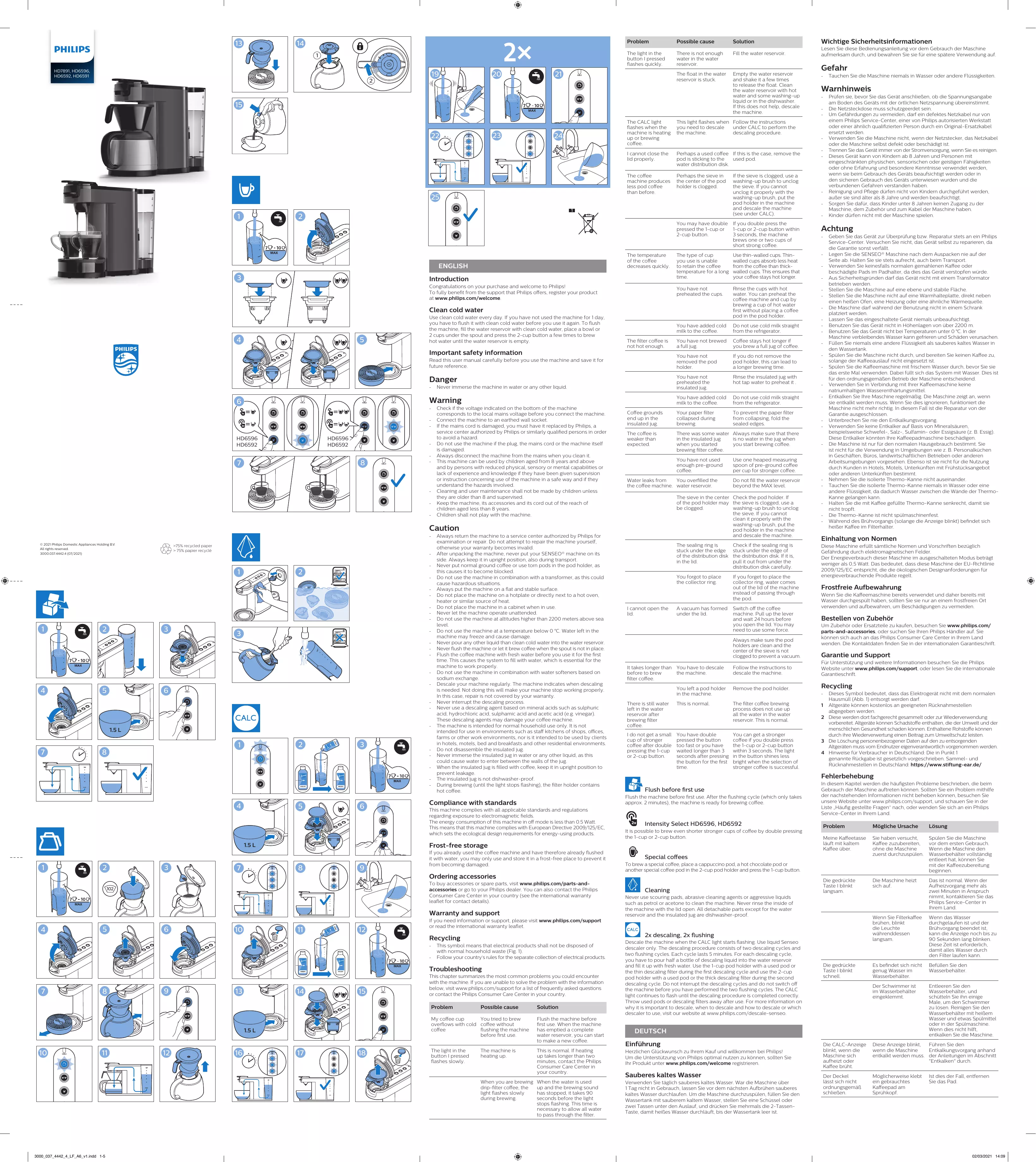 2x Entkalken, 2x Spülen Entkalken Sie die Maschine, wenn die CALC-Anzeige zu blinken beginnt. Verwenden Sie nur flüssigen Senseo Entkalker. Der Entkalkungsvorgang besteht aus zwei Entkalkungszyklen und zwei Spülzyklen. Jeder Zyklus dauert 5 Minuten. Für jeden Entkalkungsvorgang müssen Sie eine halbe Flasche Entkalkungsflüssigkeit in den Wassertank geben und diesen mit frischem Wasser auffüllen. Verwenden Sie für den ersten Entkalkungszyklus den Padhalter für 1 Tasse mit einem gebrauchten Kaffeepad oder dem dünnen Kalkfilter. Für den zweiten Entkalkungszyklus verwenden Sie dann den Padhalter für 2 Tassen mit einem gebrauchten Kaffeepad oder dem dicken Kalkfilter. Unterbrechen Sie die Entkalkungszyklen nicht, und schalten Sie die Maschine nicht vor Ablauf der zwei Spülzyklen aus. Die CALC-Anzeige blinkt so lange weiter, bis der Entkalkungsvorgang korrekt abgeschlossen ist. Entsorgen Sie gebrauchte Pads oder Entkalkungsfilter nach der Verwendung. Weitere Informationen über die Wichtigkeit des Entkalkens, Zeitpunkte und Anweisungen zum Entkalken oder den richtigen Entkalker finden Sie auf unserer Website www.philips.com/descale-senseo.