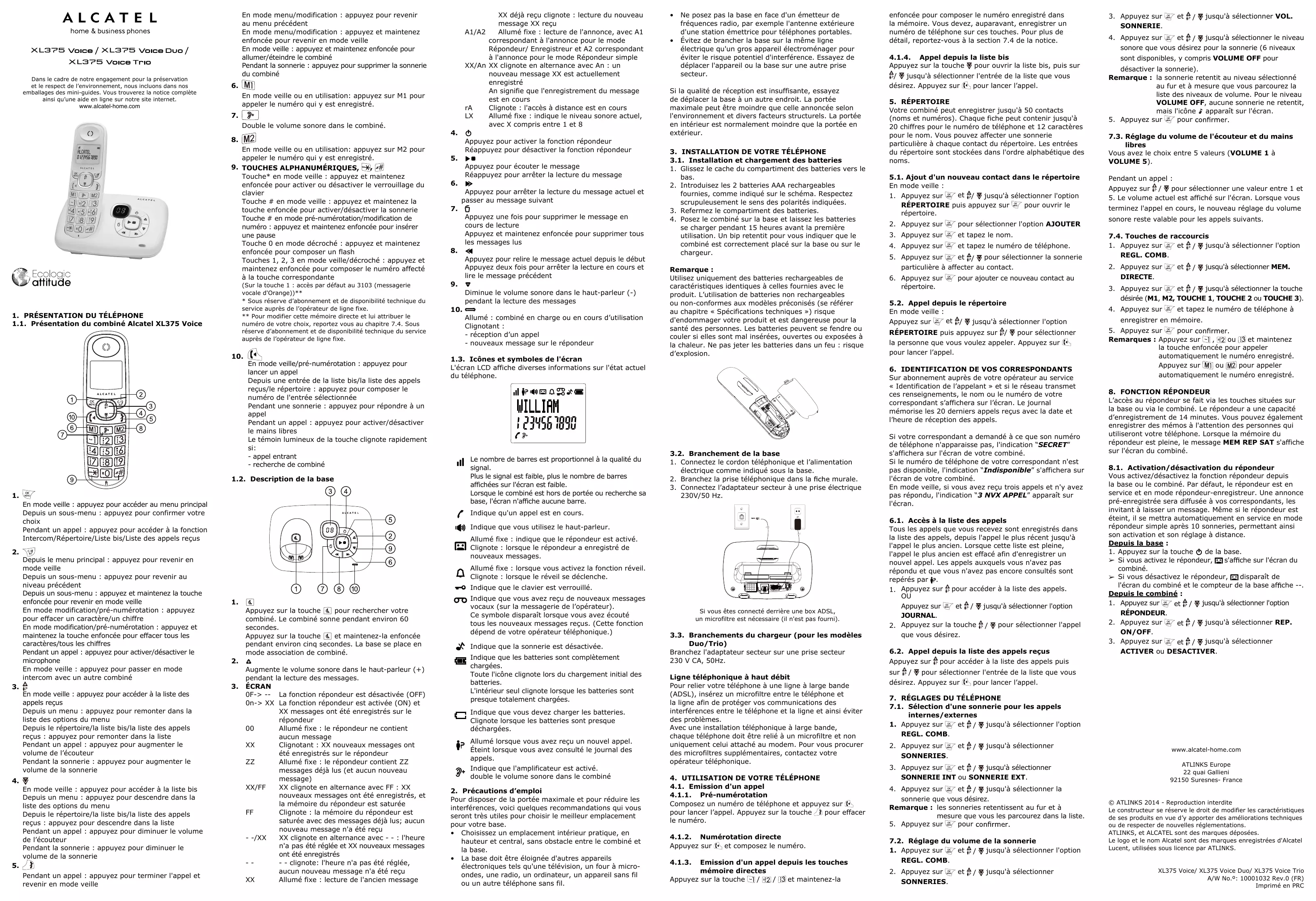 Pendant Un appel a été Répondez à l'appel l'enregistrement détecté. puis reprenez de l'annonce ou l'enregistrement de la lecture d'un votre annonce. message sur le répondeur, la sonnerie retentit et l'enregistrement ou la lecture s'arrête. Si vous avez acheté votre produit dans une agence Orange (agence Orange, 1014 ou site web) : Si vous désirez bénéficier de conseils ou d’informations quant à l’usage de ce téléphone ou si vous faites face à une panne de celui-ci, merci de contacter l’assistance technique d'Orange en appelant le 3900**. Vous obtiendrez ainsi, à distance, l’information voulue auprès d’experts. Si le diagnostic réalisé confirme un dysfonctionnement, la hotline vous indiquera les modalités d’échange du terminal auprès des services appropriés. **Temps d’attente gratuit, puis prix d’une communication locale depuis une ligne fixe analogique d'Orange(1), Coût variable selon opérateur. (1) Le prix d’une communication locale depuis une ligne fixe analogique d'Orange en métropole ou depuis le service de téléphone par internet Orange est de 0,078€ TTC par appel, puis 0,028€ TTC par minute du lundi au vendredi de 8h à 19h hors jours fériés, et de 0,078€ TTC par appel, puis 0,014€ TTC par minute le reste du temps. Si l’appel est passé depuis une ligne fixe d’un autre opérateur, consultez ses tarifs. Si vous avez acheté votre produit hors boutique Orange : Au cas où vous rencontriez un problème avec ce téléphone, consultez le chapitre « EN CAS DE PROBLEME » de la notice. Toutefois, si le problème persiste, une assistance téléphonique est à votre disposition au numéro suivant : 0820 820 217 du lundi au samedi de 8 h 00 à 19 h 00 (appel facturé selon le tarif en vigueur). Avant de contacter l’assistance technique, merci de noter le numéro de série de votre téléphone,situé sous la base et commençant par S/N° : ... Par ailleurs, nous vous prions de bien vouloir contacter l’assistance téléphonique avec un autre poste téléphonique, que celui pour lequel vous appelez et d’avoir ce dernier à portée de la main pour d’éventuelles manipulations. Le magasin où vous avez acheté votre téléphone est également en mesure de vous renseigner et d'assurer le service après-vente. 12. GARANTIE Vous êtes prié de lire attentivement le guide d’utilisation inclus dans ce coffret. Le produit Alcatel XL375 Voice et Alcatel XL375 Voice duo/trio est un équipement agréé conformément à la réglementation européenne, attesté par le marquage CE. Le produit que vous venez d’acheter est un produit technologique, il doit être manipulé avec soin. A noter : vous disposez d’une garantie légale sur ce produit conformément à la réglementation applicable à la vente des biens de consommation dans le pays dans lequel vous avez effectué cet achat. Pour toute information relative à cette garantie légale, veuillez vous adresser à votre revendeur. Sans préjudice de la garantie légale dont les produits bénéficient, ATLINKS garantit que le produit figurant dans le présent coffret est conforme à ses spécifications techniques figurant dans le guide d’utilisation inclus dans