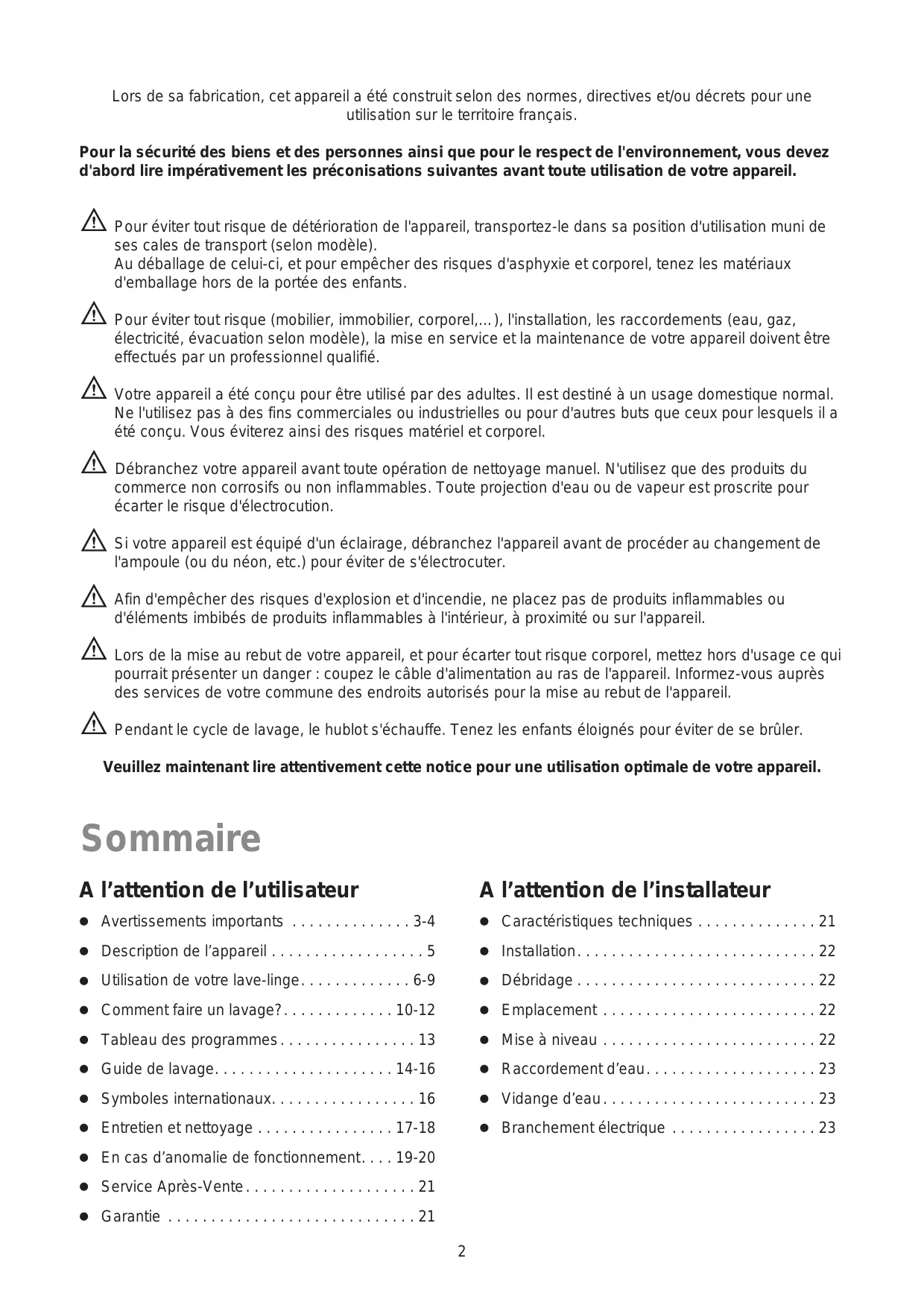 Lors de sa fabrication, cet appareil a été construit selon des normes, directives et/ou décrets pour une utilisation sur le territoire français. Pour la sécurité des biens et des personnes ainsi que pour le respect de l'environnement, vous devez d'abord lire impérativement les préconisations suivantes avant toute utilisation de votre appareil. Pour éviter tout risque de détérioration de l'appareil, transportez-le dans sa position d'utilisation muni de ses cales de transport (selon modèle). Au déballage de celui-ci, et pour empêcher des risques d'asphyxie et corporel, tenez les matériaux d'emballage hors de la portée des enfants. Pour éviter tout risque (mobilier, immobilier, corporel,…), l'installation, les raccordements (eau, gaz, électricité, évacuation selon modèle), la mise en service et la maintenance de votre appareil doivent être effectués par un professionnel qualifié. Votre appareil a été conçu pour être utilisé par des adultes. Il est destiné à un usage domestique normal. Ne l'utilisez pas à des fins commerciales ou industrielles ou pour d'autres buts que ceux pour lesquels il a été conçu. Vous éviterez ainsi des risques matériel et corporel. Débranchez votre appareil avant toute opération de nettoyage manuel. N'utilisez que des produits du commerce non corrosifs ou non inflammables. Toute projection d'eau ou de vapeur est proscrite pour écarter le risque d'électrocution. Si votre appareil est équipé d'un éclairage, débranchez l'appareil avant de procéder au changement de l'ampoule (ou du néon, etc.) pour éviter de s'électrocuter. Afin d'empêcher des risques d'explosion et d'incendie, ne placez pas de produits inflammables ou d'éléments imbibés de produits inflammables à l'intérieur, à proximité ou sur l'appareil. Lors de la mise au rebut de votre appareil, et pour écarter tout risque corporel, mettez hors d'usage ce qui pourrait présenter un danger : coupez le câble d'alimentation au ras de l'appareil. Informez-vous auprès des services de votre commune des endroits autorisés pour la mise au rebut de l'appareil. Pendant le cycle de lavage, le hublot s'échauffe. Tenez les enfants éloignés pour éviter de se brûler. Veuillez maintenant lire attentivement cette notice pour une utilisation optimale de votre appareil. Sommaire A l’attention de l’utilisateur A l’attention de l’installateur