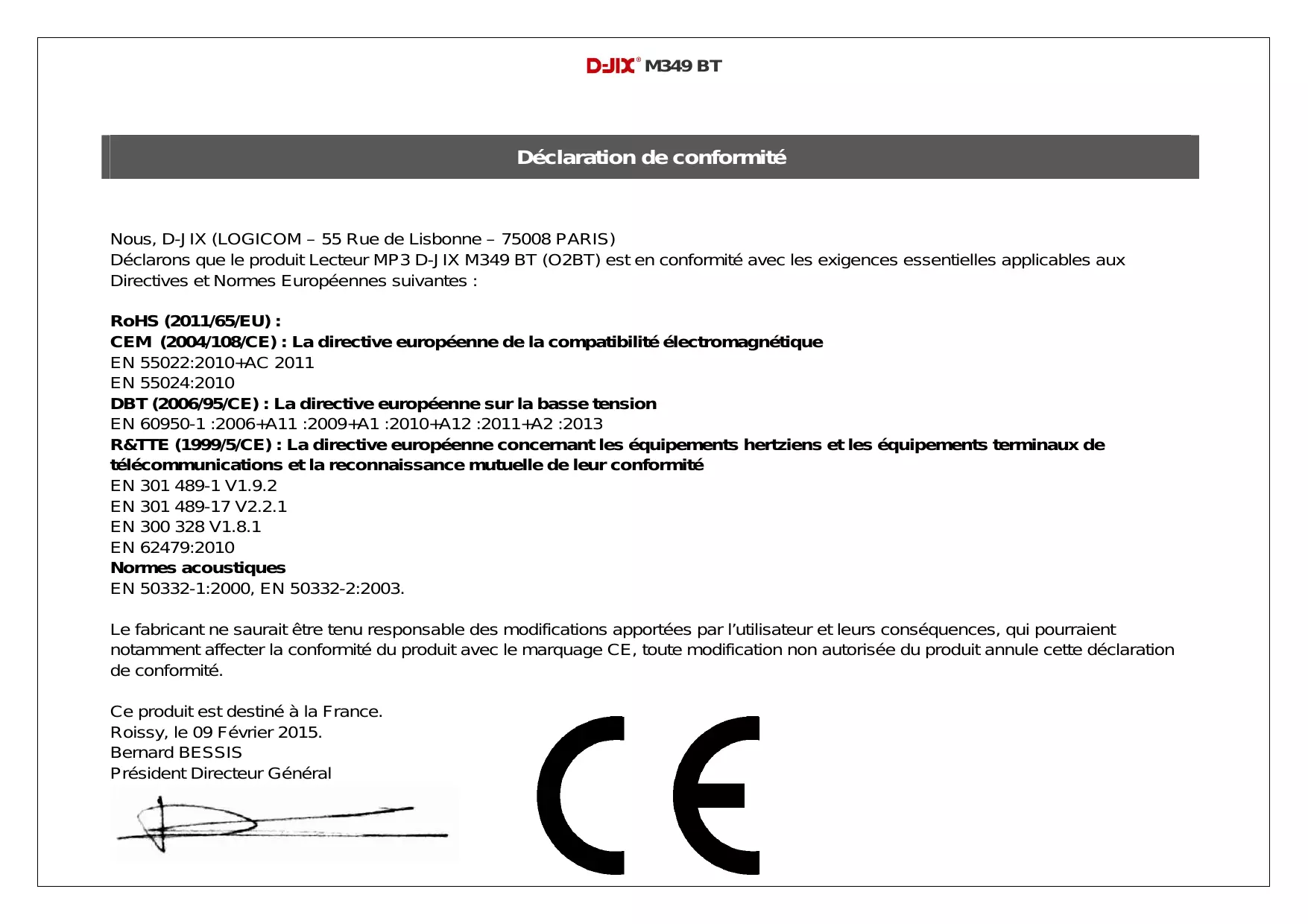 Déclarons que le produit Lecteur MP3 D-JIX M349 BT (O2BT) est en conformité avec les exigences essentielles applicables aux