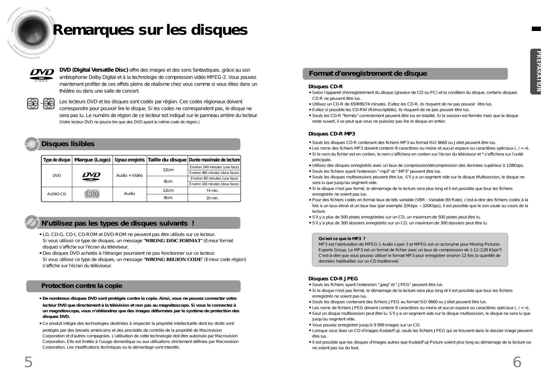 Condensation: Si votre apparéel et/ou des disques ont passé un certain temps dans une température ambiente froide, par ex. pendant un transport en hiver, attendène environ 2 heures qu'ils aient atteint la température ambiente afin d'éviter des dégàts sérieux.