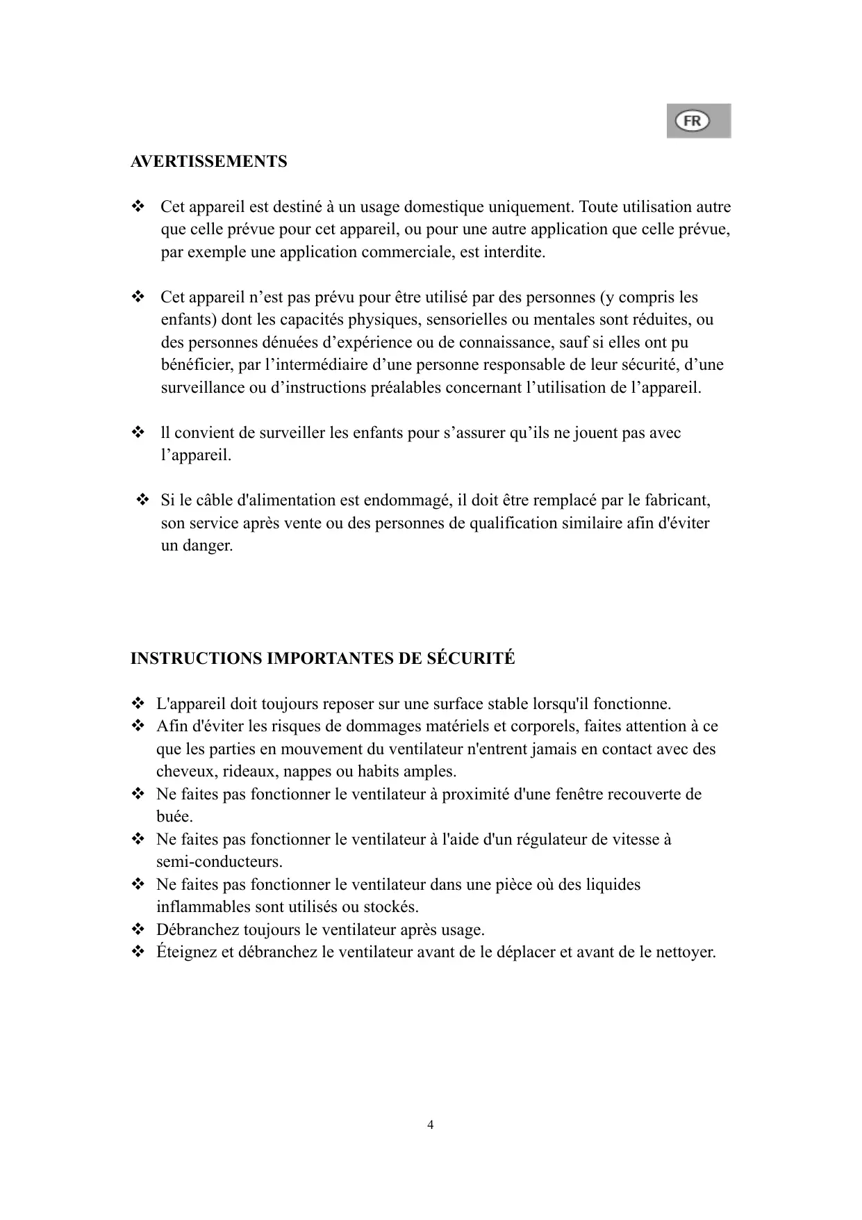 L'appareil doit toujours reposer sur une surface stable lorsqu'il fonctionne. Afin d'éviter les risques de dommages matériels et corporels, faites attention à ce que les parties en mouvement du ventilateur n'entrent jamais en contact avec des cheveux, rideaux, nappes ou habits amples. Ne faites pas fonctionner le ventilateur à proximité d'une fenêtre recouverte de buée. Ne faites pas fonctionner le ventilateur à l'aide d'un régulateur de vitesse à semi-conducteurs. Ne faites pas fonctionner le ventilateur dans une pièce où des liquides inflammables sont utilisés ou stockés. Débranchez toujours le ventilateur après usage. Éteignez et débranchez le ventilateur avant de le déplacer et avant de le nettoyer.