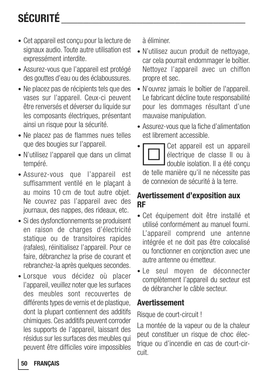 SÉCURITÉ___________________________________ Cet appareil est conçu pour la lecture de signaux audio. Toute autre utilisation est expressément interdite. • Assurez-vous que l’appareil est protégé des gouttes d’eau ou des éclaboussures. • Ne placez pas de récipients tels que des vases sur l’appareil. Ceux-ci peuvent être renversés et déverser du liquide sur les composants électriques, présentant ainsi un risque pour la sécurité. • Ne placez pas de flammes nues telles que des bougies sur l’appareil. • N’utilisez l’appareil que dans un climat tempéré. • Assurez-vous que l’appareil est suffisamment ventilé en le plaçant à au moins 10 cm de tout autre objet. Ne couvrez pas l’appareil avec des journaux, des nappes, des rideaux, etc. • Si des dysfonctionnements se produisent en raison de charges d’électricité statique ou de transitoires rapides (rafales), réinitialisez l’appareil. Pour ce faire, débranchez la prise de courant et rebranchez-la après quelques secondes. • Lorsque vous décidez où placer l’appareil, veuillez noter que les surfaces des meubles sont recouvertes de différents types de vernis et de plastique, dont la plupart contiennent des additifs chimiques. Ces additifs peuvent corroder les supports de l’appareil, laissant des résidus sur les surfaces des meubles qui peuvent être difficiles voire impossibles •