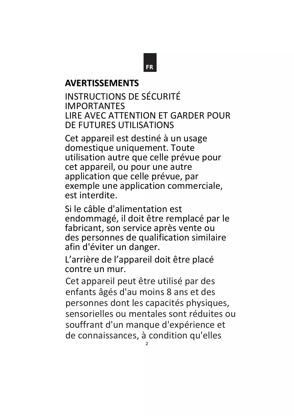 Cet appareil est destiné à un usage domestique uniquement. Toute utilisation autre que celle prévue pour cet appareil, ou pour une autre application que celle prévue, par exemple une application commerciale, est interdite. Si le câble d'alimentation est endommagé, il doit être remplacé par le fabricant, son service après vente ou des personnes de qualification similaire afin d'éviter un danger. L’arrière de l’appareil doit être placé contre un mur. Cet appareil peut être utilisé par des enfants âgés d'au moins 8 ans et des personnes dont les capacités physiques, sensorielles ou mentales sont réduites ou souffrant d'un manque d'expérience et de connaissances, à condition qu'elles