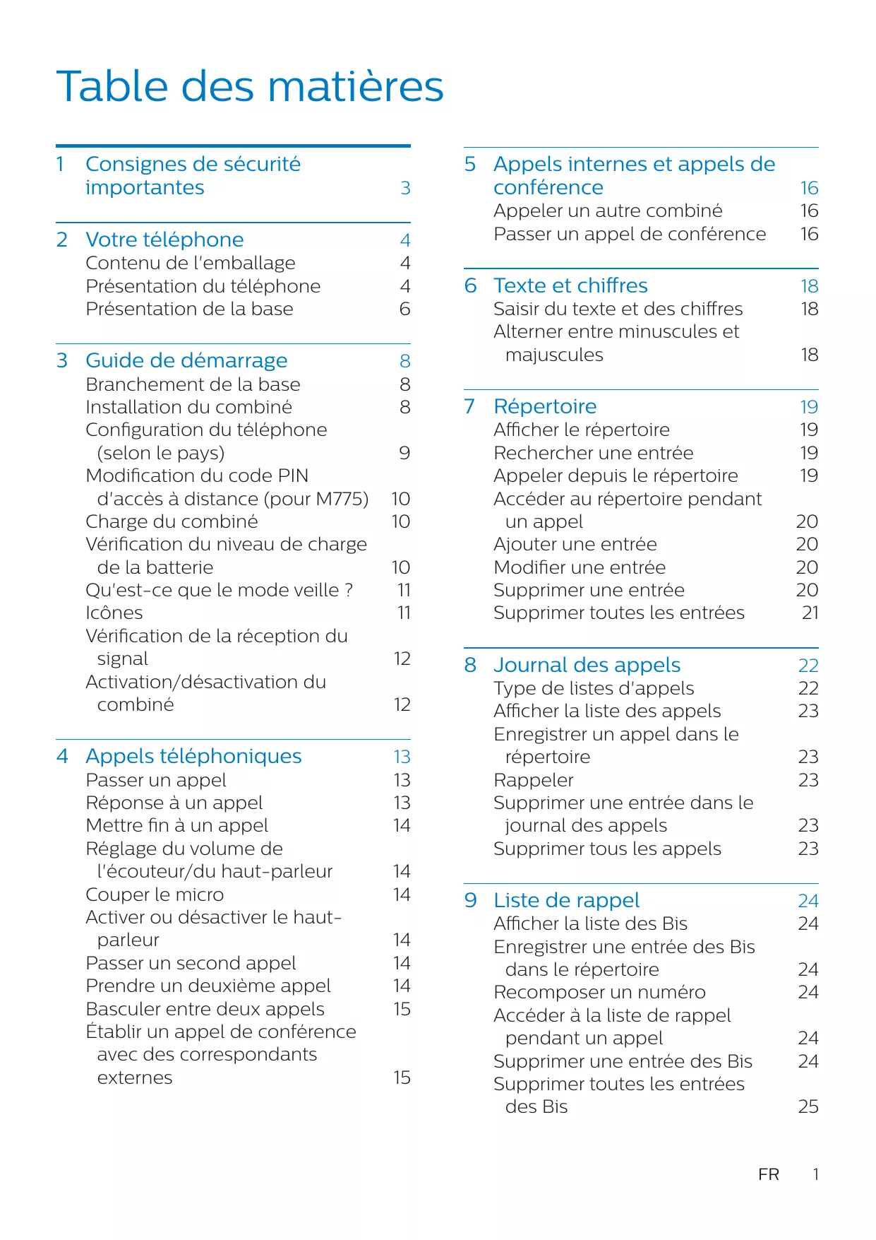 Consignes de sécurité importantes 2 Votre téléphone Contenu de l'emballage Présentation du téléphone Présentation de la base 3 Guide de démarrage Branchement de la base Installation du combiné Configuration du téléphone (selon le pays) Modification du code PIN d'accès à distance (pour M775) Charge du combiné Vérification du niveau de charge de la batterie Qu'est-ce que le mode veille ? Icônes Vérification de la réception du signal Activation/désactivation du combiné 4 Appels téléphoniques Passer un appel Réponse à un appel Mettre fin à un appel Réglage du volume de l'écouteur/du haut-parleur Couper le micro Activer ou désactiver le hautparleur Passer un second appel Prendre un deuxième appel Basculer entre deux appels Établir un appel de conférence avec des correspondants externes