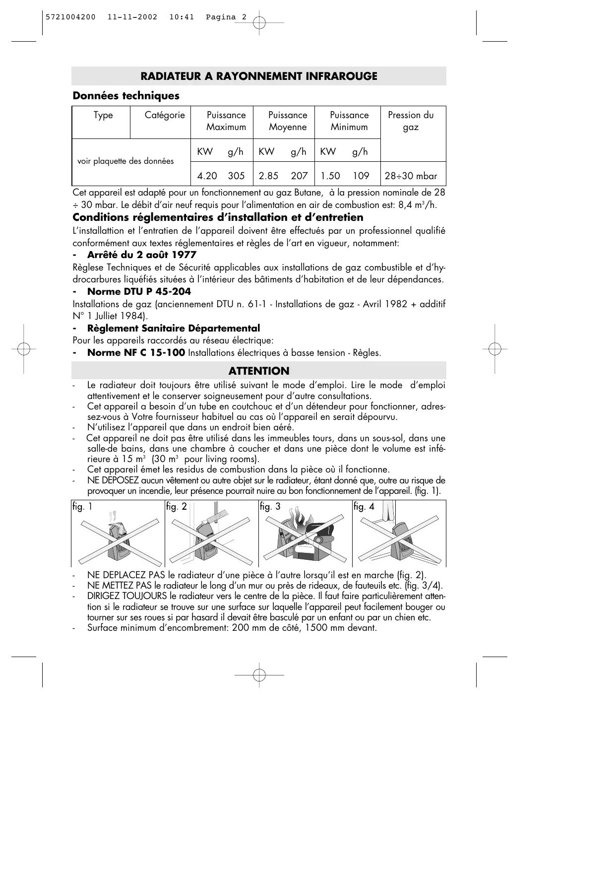 Le radiateur doit toujours être utilisé suivant le mode d’emploi. Lire le mode d’emploi attentivement et le conserver soigneusement pour d’autre consultations. Cet appareil a besoin d’un tube en coutchouc et d’un détendeur pour fonctionner, adressez-vous à Votre fournisseur habituel au cas où l’appareil en serait dépourvu. N’utilisez l’appareil que dans un endroit bien aéré. Cet appareil ne doit pas être utilisé dans les immeubles tours, dans un sous-sol, dans une salle-de bains, dans une chambre à coucher et dans une pièce dont le volume est inférieure à 15 m3 (30 m3 pour living rooms). Cet appareil émet les residus de combustion dans la pièce où il fonctionne. NE DEPOSEZ aucun vêtement ou autre objet sur le radiateur, étant donné que, outre au risque de provoquer un incendie, leur présence pourrait nuire au bon fonctionnement de l’appareil. (fig. 1). NE DEPLACEZ PAS le radiateur d’une pièce à l’autre lorsqu’il est en marche (fig. 2). NE METTEZ PAS le radiateur le long d’un mur ou près de rideaux, de fauteuils etc. (fig. 3/4). DIRIGEZ TOUJOURS le radiateur vers le centre de la pièce. Il faut faire particulièrement attention si le radiateur se trouve sur une surface sur laquelle l’appareil peut facilement bouger ou tourner sur ses roues si par hasard il devait être basculé par un enfant ou par un chien etc. Surface minimum d’encombrement: 200 mm de côté, 1500 mm devant.