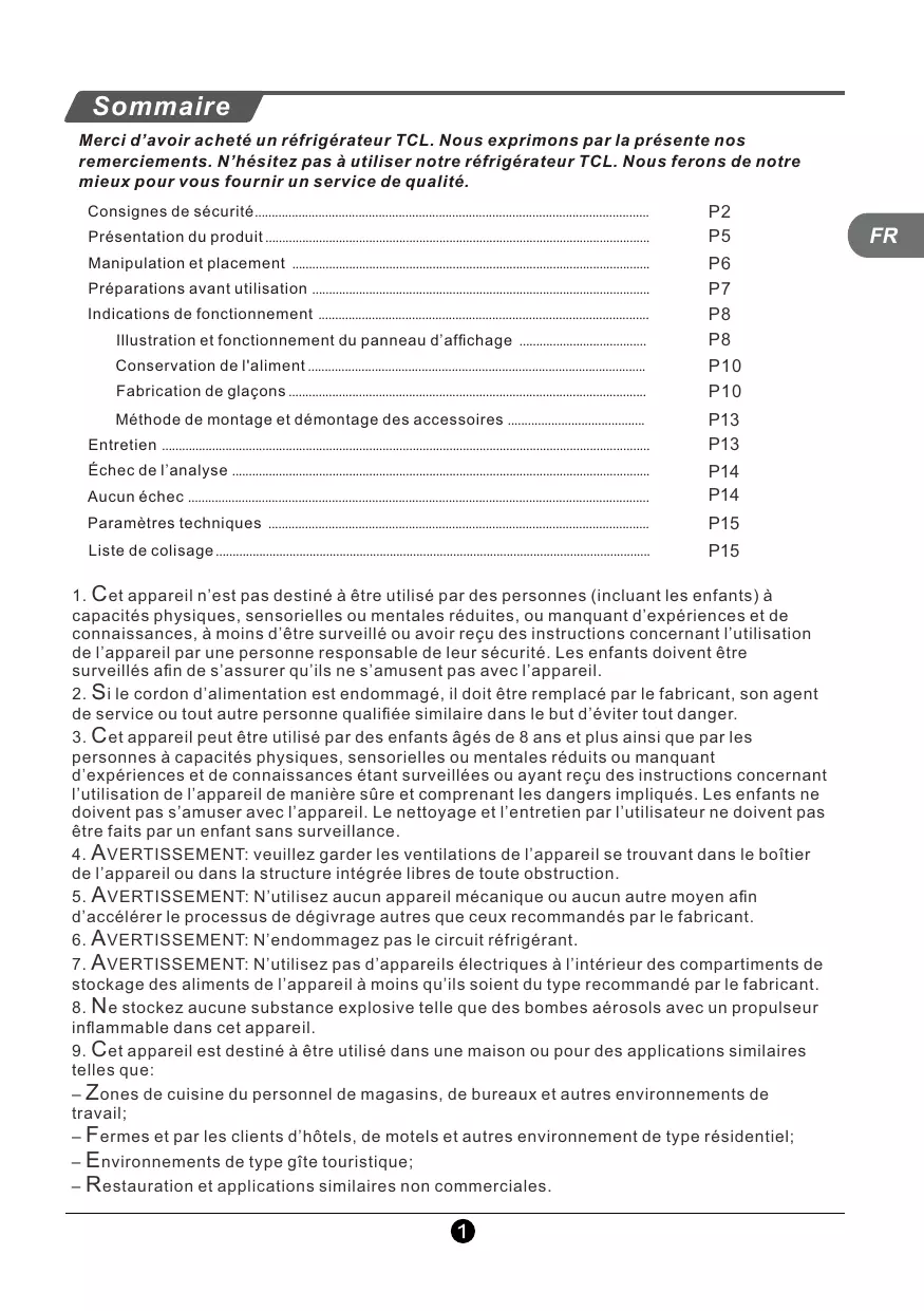 2. S i le cordon d’alimentation est endommagé, il doit être remplacé par le fabricant, son agent de service ou tout autre personne qualifiée similaire dans le but d’éviter tout danger. 3. C et appareil peut être utilisé par des enfants âgés de 8 ans et plus ainsi que par les personnes à capacités physiques, sensorielles ou mentales réduits ou manquant d’expériences et de connaissances étant surveillées ou ayant reçu des instructions concernant l’utilisation de l’appareil de manière sûre et comprenant les dangers impliqués. Les enfants ne doivent pas s’amuser avec l’appareil. Le nettoyage et l’entretien par l’utilisateur ne doivent pas être faits par un enfant sans surveillance. 4. A VERTISSEMENT: veuillez garder les ventilations de l’appareil se trouvant dans le boîtier de l’appareil ou dans la structure intégrée libres de toute obstruction. 5. A VERTISSEMENT: N’utilisez aucun appareil mécanique ou aucun autre moyen afin d’accélérer le processus de dégivrage autres que ceux recommandés par le fabricant. 6. A VERTISSEMENT: N’endommagez pas le circuit réfrigérant. 7. A VERTISSEMENT: N’utilisez pas d’appareils électriques à l’intérieur des compartiments de stockage des aliments de l’appareil à moins qu’ils soient du type recommandé par le fabricant. 8. N e stockez aucune substance explosive telle que des bombes aérosols avec un propulseur inflammable dans cet appareil. 9. C et appareil est destiné à être utilisé dans une maison ou pour des applications similaires telles que: – Z ones de cuisine du personnel de magasins, de bureaux et autres environnements de travail; – F ermes et par les clients d’hôtels, de motels et autres environnement de type résidentiel; – E nvironnements de type gîte touristique; – R estauration et applications similaires non commerciales.