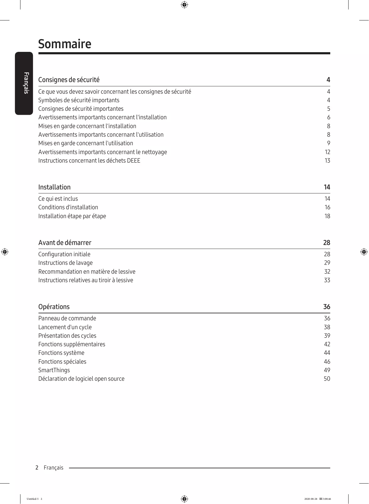 Panneau de commande Lancement d'un cycle Présentation des cycles Fonctions supplémentaires Fonctions système Fonctions spéciales SmartThings Déclaration de logiciel open source