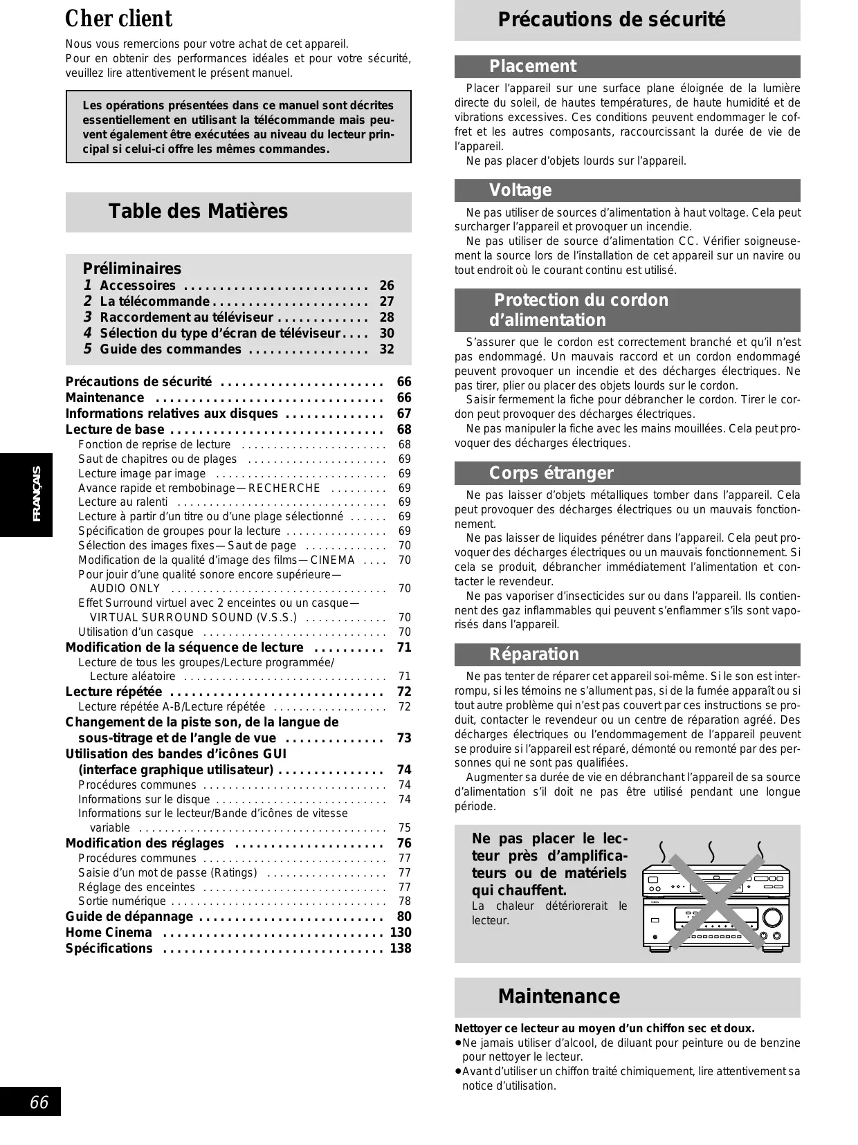 Guide de dépannage . . . . . . . . . . . . . . . . . . . . . . . . . . 080 Home Cinema . . . . . . . . . . . . . . . . . . . . . . . . . . . . . . . 130 Spécifications . . . . . . . . . . . . . . . . . . . . . . . . . . . . . . . 138 Protection du cordon d’alimentation S’assurer que le cordon est correctement branché et qu’il n’est pas endommagé. Un mauvais raccord et un cordon endommagé peuvent provoquer un incendie et des décharges électriques. Ne pas tirer, plier ou placer des objets lourds sur le cordon. Saisir fermement la fiche pour débrancher le cordon. Tirer le cordon peut provoquer des décharges électriques. Ne pas manipuler la fiche avec les mains mouillées. Cela peut provoquer des décharges électriques. Corps étranger Ne pas laisser d’objets métalliques tomber dans l’appareil. Cela peut provoquer des décharges électriques ou un mauvais fonctionnement. Ne pas laisser de liquides pénétrer dans l’appareil. Cela peut provoquer des décharges électriques ou un mauvais fonctionnement. Si cela se produit, débrancher immédiatement l’alimentation et contacter le revendeur. Ne pas vaporiser d’insecticides sur ou dans l’appareil. Ils contiennent des gaz inflammables qui peuvent s’enflammer s’ils sont vaporisés dans l’appareil. Réparation Ne pas tenter de réparer cet appareil soi-même. Si le son est interrompu, si les témoins ne s’allument pas, si de la fumée apparaît ou si tout autre problème qui n’est pas couvert par ces instructions se produit, contacter le revendeur ou un centre de réparation agréé. Des décharges électriques ou l’endommagement de l’appareil peuvent se produire si l’appareil est réparé, démonté ou remonté par des personnes qui ne sont pas qualifiées. Augmenter sa durée de vie en débranchant l’appareil de sa source d’alimentation s’il doit ne pas être utilisé pendant une longue période. Ne pas placer le lecteur près d’amplificateurs ou de matériels qui chauffent. La chaleur détériorerait le lecteur. Maintenance Nettoyer ce lecteur au moyen d’un chiffon sec et doux. ≥Ne jamais utiliser d’alcool, de diluant pour peinture ou de benzine pour nettoyer le lecteur. ≥Avant d’utiliser un chiffon traité chimiquement, lire attentivement sa notice d’utilisation.