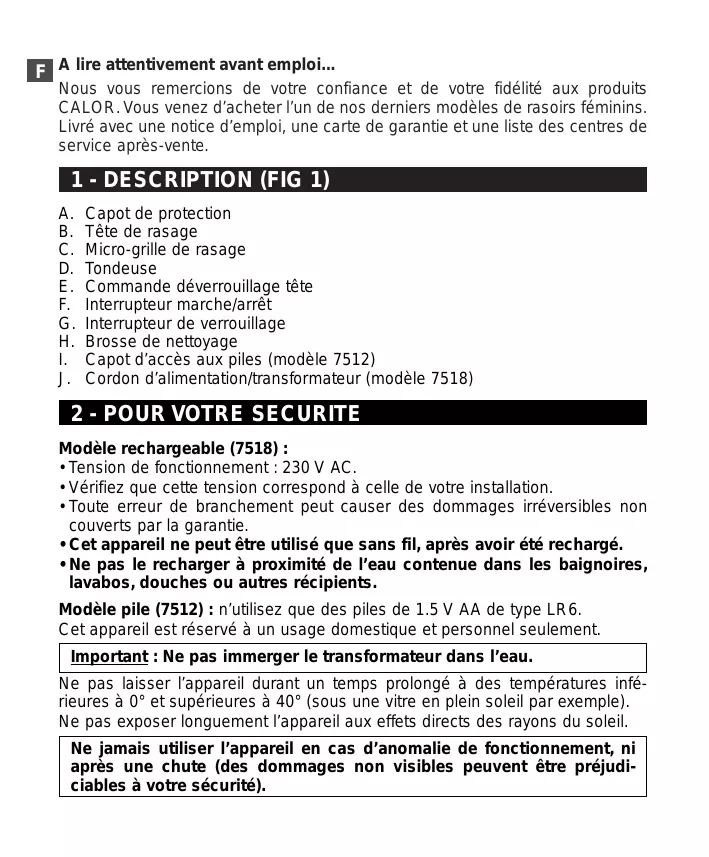 Nous vous remercions de votre confiance et de votre fidéité aux produits CALOR. Vous venez d'acheter l'un de nos derniers modèles de rasoirs féminins. Livré avec une notice d'emploi, une carte de garantie et une liste des centres de service après-venture.