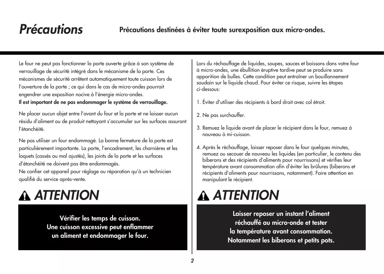 Votre four à micro-ondes est l'un des apparéils electroménagers les plus surs. Lorsque la porte est ouverte, le four cesse immédiatement de produit des micro-ondes. L'énergie micro-ondes est totalément convertie en chaleur lorsqu'elle pénétre la nourriture, ne dégageant aucune énergie résiduelle nocive pour la personne qui cuisine.