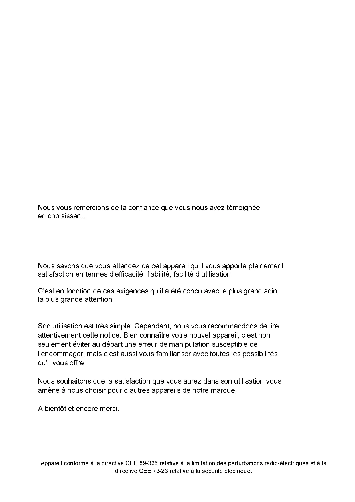 Nous vous remercions de la confiance que vous nous avez témoignée en choisissant: