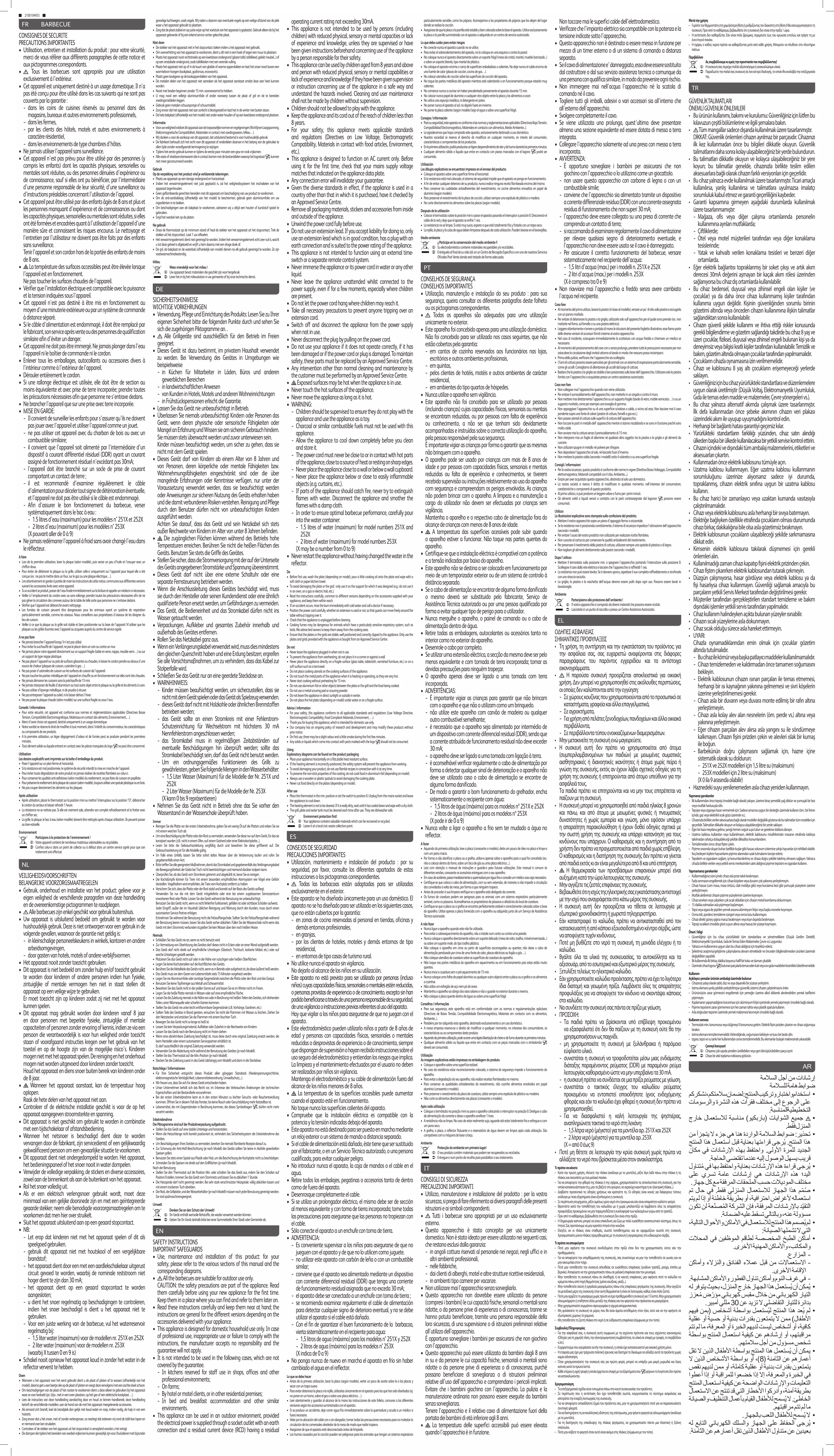 • Cet appareil est uniquement destiné à un usage domestique. Il n’a pas été conçu pour être utilisé dans les cas suivants qui ne sont pas couverts par la garantie : −− dans les coins de cuisines réservés au personnel dans des magasins, bureaux et autres environnements professionnels, −− dans les fermes, −− par les clients des hôtels, motels et autres environnements à caractère résidentiel, −− dans les environnements de type chambres d’hôtes. • Ne jamais utiliser l’appareil sans surveillance. • Cet appareil n’est pas prévu pour être utilisé par des personnes (y compris les enfants) dont les capacités physiques, sensorielles ou mentales sont réduites, ou des personnes dénuées d’expérience ou de connaissance, sauf si elles ont pu bénéficier, par l’intermédiaire d’une personne responsable de leur sécurité, d’une surveillance ou d’instructions préalables concernant l’utilisation de l’appareil. • Cet appareil peut être utilisé par des enfants âgés de 8 ans et plus et les personnes manquant d’expérience et de connaissances ou dont les capacités physiques, sensorielles ou mentales sont réduites, si elles ont été formées et encadrées quant à l’utilisation de l’appareil d’une manière sûre et connaissent les risques encourus. Le nettoyage et l’entretien par l’utilisateur ne doivent pas être faits par des enfants sans surveillance. Tenir l’appareil et son cordon hors de la portée des enfants de moins de 8 ans. • La température des surfaces accessibles peut être élevée lorsque l’appareil est en fonctionnement. Ne pas toucher les surfaces chaudes de l’appareil. • Vérifier que l’installation électrique est compatible avec la puissance et la tension indiquées sous l’appareil. • Cet appareil n’est pas destiné à être mis en fonctionnement au moyen d’une minuterie extérieure ou par un système de commande à distance séparé. • Si le câble d’alimentation est endommagé, il doit être remplacé par le fabricant, son service après vente ou des personnes de qualification similaire afin d’éviter un danger. • Cet appareil ne doit pas être immergé. Ne jamais plonger dans l’eau l’appareil ni le boîtier de commande ni le cordon. • Enlever tous les emballages, autocollants ou accessoires divers à l’intérieur comme à l’extérieur de l’appareil. • Dérouler entièrement le cordon. • Si une rallonge électrique est utilisée, elle doit être de section au moins équivalente et avec prise de terre incorporée; prendre toutes les pré­cau­tions néces­saires afin que personne ne s’entrave dedans. • Ne brancher l’appareil que sur une prise avec terre incorporée. • MISE EN GARDE: −− Il convient de surveiller les enfants pour s’assurer qu’ils ne doivent pas jouer avec l’appareil et utiliser l’appareil comme un jouet. −− ne pas utiliser cet appareil avec du charbon de bois ou avec un combustible similaire; −− il convient que l’appareil soit alimenté par l’intermédiaire d’un dispositif à courant différentiel résiduel (DDR) ayant un courant assigné de fonctionnement résiduel n’excédant pas 30mA; −− l’appareil doit être branché sur un socle de prise de courant comportant un contact de terre ; −− il est recommandé d’examiner régulièrement le câble d’alimentation pour déceler tout signe de détérioration éventuelle, et l’appareil ne doit pas être utilisé si le câble est endommagé. −− Afin d’assurer le bon fonctionnement du barbecue, verser systématiquement dans le bac à eau : −− 1.5 litres d’eau (maximum) pour les modèles n° 251X et 252X −− 2 litres d’eau (maximum) pour les modèles n° 253X (X pouvant aller de 0 à 9) • Ne jamais redémarrer l’appareil à froid sans avoir changé l’eau dans le réflecteur. A faire • Lors de la première utilisation, laver la plaque (selon modèle), puis verser un peu d’huile et l’essuyer avec un chiffon doux. • Pour éviter de détériorer la plaque ou la grille, utiliser celle-ci uniquement sur l’appareil pour lequel elle a été conçue (ex : ne pas la mettre dans un four, sur le gaz ou une plaque électrique…). • Lire attentivement et garder à portée de main les instructions de cette notice, communes aux différentes versions suivant les accessoires livrés avec votre appareil. • Si un accident se produit, passer de l’eau froide immédiatement sur la brûlure et appeler un médecin si nécessaire. • Veiller à l’emplacement du cordon avec ou sans rallonge, prendre toutes les précautions nécessaires afin de ne pas gêner la circulation des convives autour de la table de telle sorte que personne ne s’entrave dedans. • Vérifier que l’appareil est débranché avant nettoyage. • Les fumées de cuisson peuvent être dangereuses pour les animaux ayant un système de respiration particulièrement sensible, comme les oiseaux. Nous conseillons aux propriétaires d’oiseaux de les éloigner du lieu de cuisson. • Veiller à ce que la plaque ou la grille soit stable et bien positionnée sur la base de l’appareil. N’utiliser que les plaques ou les grilles fournies avec l’appareil ou acquises auprès du centre de service agréé. A ne pas faire • Ne jamais brancher l’appareil lorsqu’il n’est pas utilisé. • Pour éviter la surchauffe de l’appareil, ne pas le placer dans un coin ou contre un mur. • Ne jamais placer votre appareil directement sur un support fragile (table en verre, nappe, meuble verni…) ou sur un support de type nappe plastique. • Ne pas placer l’appareil sur ou près de surfaces glissantes ou chaudes, ni laisser le cordon pendre au-dessus d’une source de chaleur (plaques de cuisson, cuisinière à gaz…). • Ne pas poser d’ustensiles de cuisson sur les surfaces de cuisson de l’appareil. • Ne pas toucher les parties métalliques de l’appareil en chau