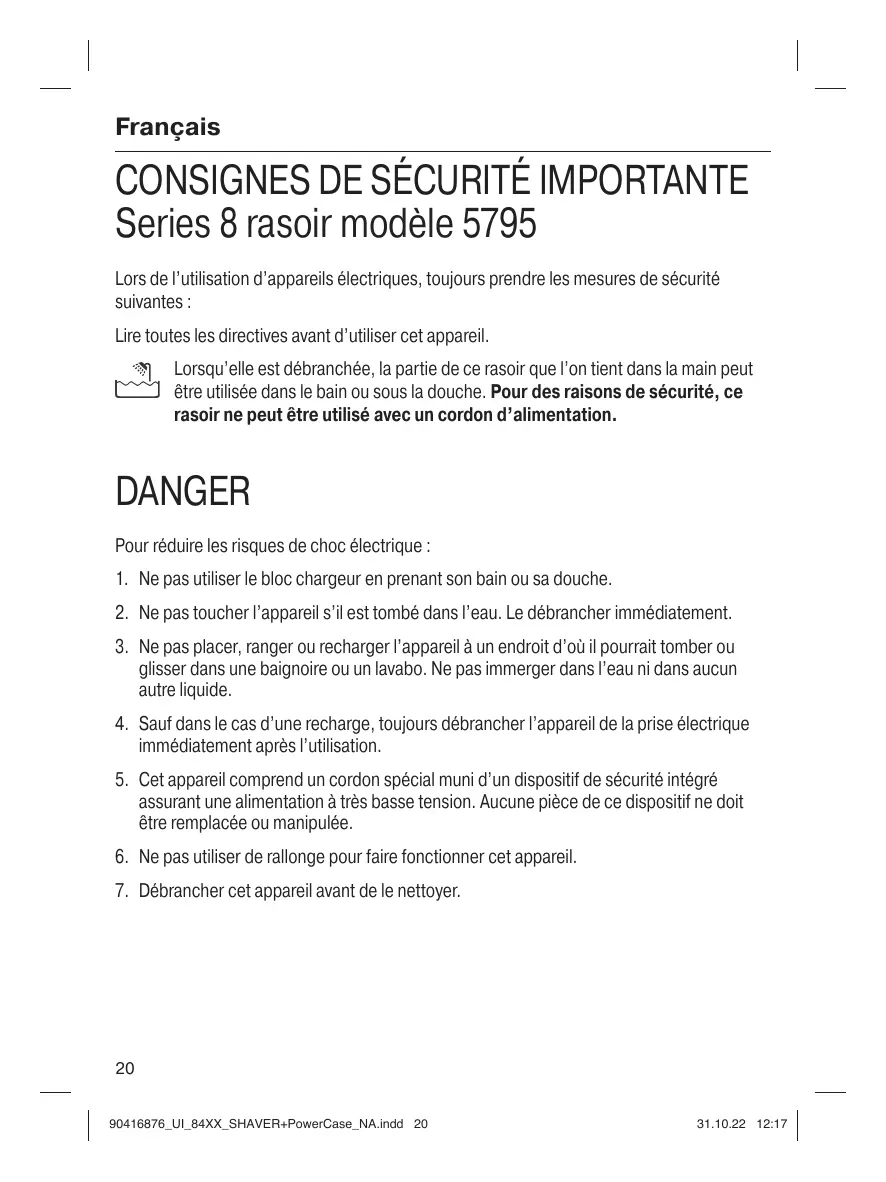 CONSIGNES DE SÉCURITÉ IMPORTANTE Series 8 rasoir modèle 5795 Lors de l’utilisation d’appareils électriques, toujours prendre les mesures de sécurité suivantes : Lire toutes les directives avant d’utiliser cet appareil. Lorsqu’elle est débranchée, la partie de ce rasoir que l’on tient dans la main peut être utilisée dans le bain ou sous la douche. Pour des raisons de sécurité, ce rasoir ne peut être utilisé avec un cordon d’alimentation.