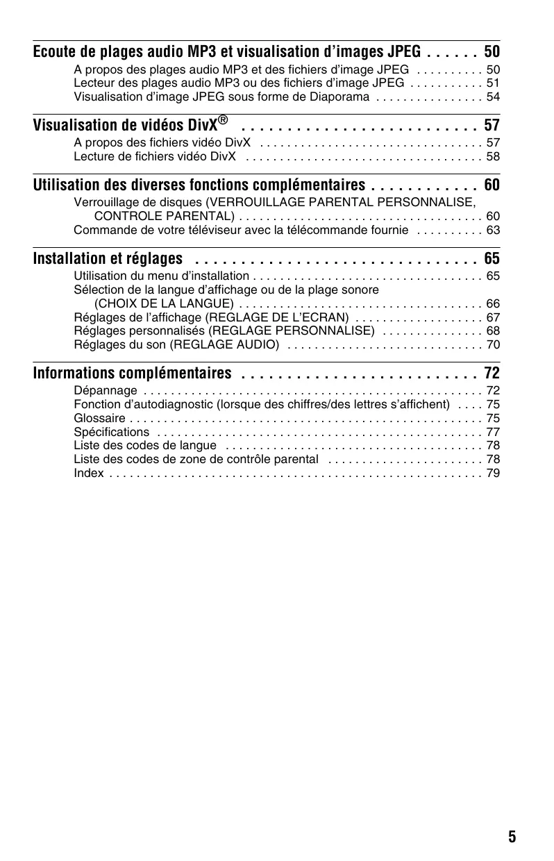 Ecoute de plages audio MP3 et visualisation d’images JPEG . . . . . . 50 A propos des plages audio MP3 et des fichiers d’image JPEG . . . . . . . . . . 50 Lecteur des plages audio MP3 ou des fichiers d’image JPEG . . . . . . . . . . . 51 Visualisation d’image JPEG sous forme de Diaporama . . . . . . . . . . . . . . . . 54 Visualisation de vidéos DivX® . . . . . . . . . . . . . . . . . . . . . . . . . . 57 A propos des fichiers vidéo DivX . . . . . . . . . . . . . . . . . . . . . . . . . . . . . . . . . 57 Lecture de fichiers vidéo DivX . . . . . . . . . . . . . . . . . . . . . . . . . . . . . . . . . . . 58 Utilisation des diverses fonctions complémentaires . . . . . . . . . . . . 60 Verrouillage de disques (VERROUILLAGE PARENTAL PERSONNALISE, CONTROLE PARENTAL) . . . . . . . . . . . . . . . . . . . . . . . . . . . . . . . . . . . . 60 Commande de votre téléviseur avec la télécommande fournie . . . . . . . . . . 63 Installation et réglages . . . . . . . . . . . . . . . . . . . . . . . . . . . . . . . 65 Utilisation du menu d’installation . . . . . . . . . . . . . . . . . . . . . . . . . . . . . . . . . . Sélection de la langue d’affichage ou de la plage sonore (CHOIX DE LA LANGUE) . . . . . . . . . . . . . . . . . . . . . . . . . . . . . . . . . . . . Réglages de l’affichage (REGLAGE DE L’ECRAN) . . . . . . . . . . . . . . . . . . . Réglages personnalisés (REGLAGE PERSONNALISE) . . . . . . . . . . . . . . . Réglages du son (REGLAGE AUDIO) . . . . . . . . . . . . . . . . . . . . . . . . . . . . .