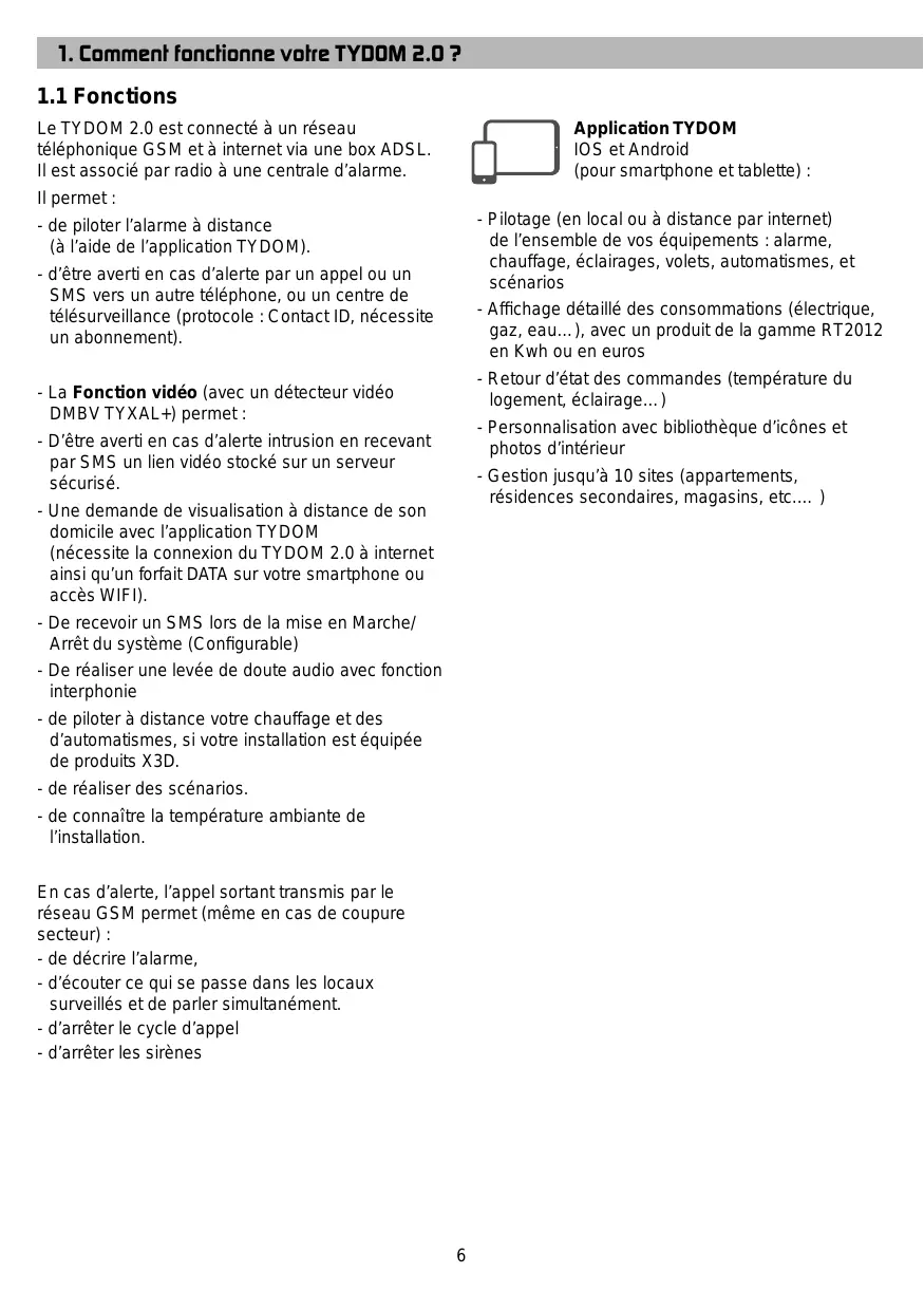 Application TYDOM IOS et Android (pour smartphone et tablette) : Le TYDOM 2.0 est connecté à un réseau téléphonique GSM et à internet via une box ADSL. Il est associé par radio à une centrale d’alarme. Il permet : - Pilotage (en local ou à distance par internet) de l’ensemble de vos équipements : alarme, chauffage, éclairages, volets, automatismes, et scénarios - de piloter l’alarme à distance (à l’aide de l’application TYDOM). - d’être averti en cas d’alerte par un appel ou un SMS vers un autre téléphone, ou un centre de télésurveillance (protocole : Contact ID, nécessite un abonnement). - Affichage détaillé des consommations (électrique, gaz, eau…), avec un produit de la gamme RT2012 en Kwh ou en euros - Retour d’état des commandes (température du logement, éclairage…) - La Fonction vidéo (avec un détecteur vidéo DMBV TYXAL+) permet : - Personnalisation avec bibliothèque d’icônes et photos d’intérieur - D’être averti en cas d’alerte intrusion en recevant par SMS un lien vidéo stocké sur un serveur sécurisé. - Gestion jusqu’à 10 sites (appartements, résidences secondaires, magasins, etc.… ) - Une demande de visualisation à distance de son domicile avec l’application TYDOM (nécessite la connexion du TYDOM 2.0 à internet ainsi qu’un forfait DATA sur votre smartphone ou accès WIFI). - De recevoir un SMS lors de la mise en Marche/ Arrêt du système (Configurable) - De réaliser une levée de doute audio avec fonction interphonie - de piloter à distance votre chauffage et des d’automatismes, si votre installation est équipée de produits X3D. - de réaliser des scénarios. - de connaître la température ambiante de l’installation. En cas d’alerte, l’appel sortant transmis par le réseau GSM permet (même en cas de coupure secteur) : - de décrire l’alarme, - d’écouter ce qui se passe dans les locaux surveillés et de parler simultanément. - d’arrêter le cycle d’appel - d’arrêter les sirènes