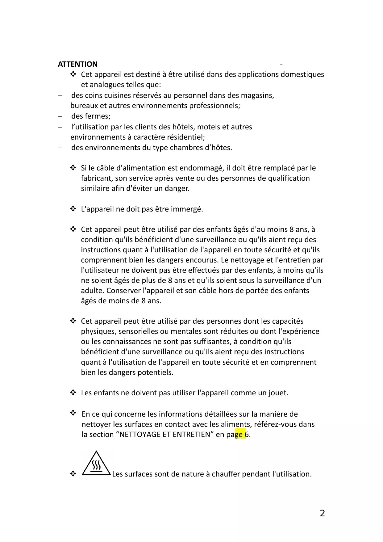 ATTENTION Cet appareil est destiné à être utilisé dans des applications domestiques et analogues telles que: des coins cuisines réservés au personnel dans des magasins, bureaux et autres environnements professionnels; des fermes; l’utilisation par les clients des hôtels, motels et autres environnements à caractère résidentiel; des environnements du type chambres d’hôtes. Si le câble d'alimentation est endommagé, il doit être remplacé par le fabricant, son service après vente ou des personnes de qualification similaire afin d'éviter un danger. L'appareil ne doit pas être immergé. Cet appareil peut être utilisé par des enfants âgés d'au moins 8 ans, à condition qu'ils bénéficient d'une surveillance ou qu'ils aient reçu des instructions quant à l'utilisation de l'appareil en toute sécurité et qu'ils comprennent bien les dangers encourus. Le nettoyage et l'entretien par l'utilisateur ne doivent pas être effectués par des enfants, à moins qu'ils ne soient âgés de plus de 8 ans et qu'ils soient sous la surveillance d'un adulte. Conserver l'appareil et son câble hors de portée des enfants âgés de moins de 8 ans. Cet appareil peut être utilisé par des personnes dont les capacités physiques, sensorielles ou mentales sont réduites ou dont l'expérience ou les connaissances ne sont pas suffisantes, à condition qu'ils bénéficient d'une surveillance ou qu'ils aient reçu des instructions quant à l'utilisation de l'appareil en toute sécurité et en comprennent bien les dangers potentiels. Les enfants ne doivent pas utiliser l'appareil comme un jouet. En ce qui concerne les informations détaillées sur la manière de nettoyer les surfaces en contact avec les aliments, référez-vous dans la section “NETTOYAGE ET ENTRETIEN” en page 6.