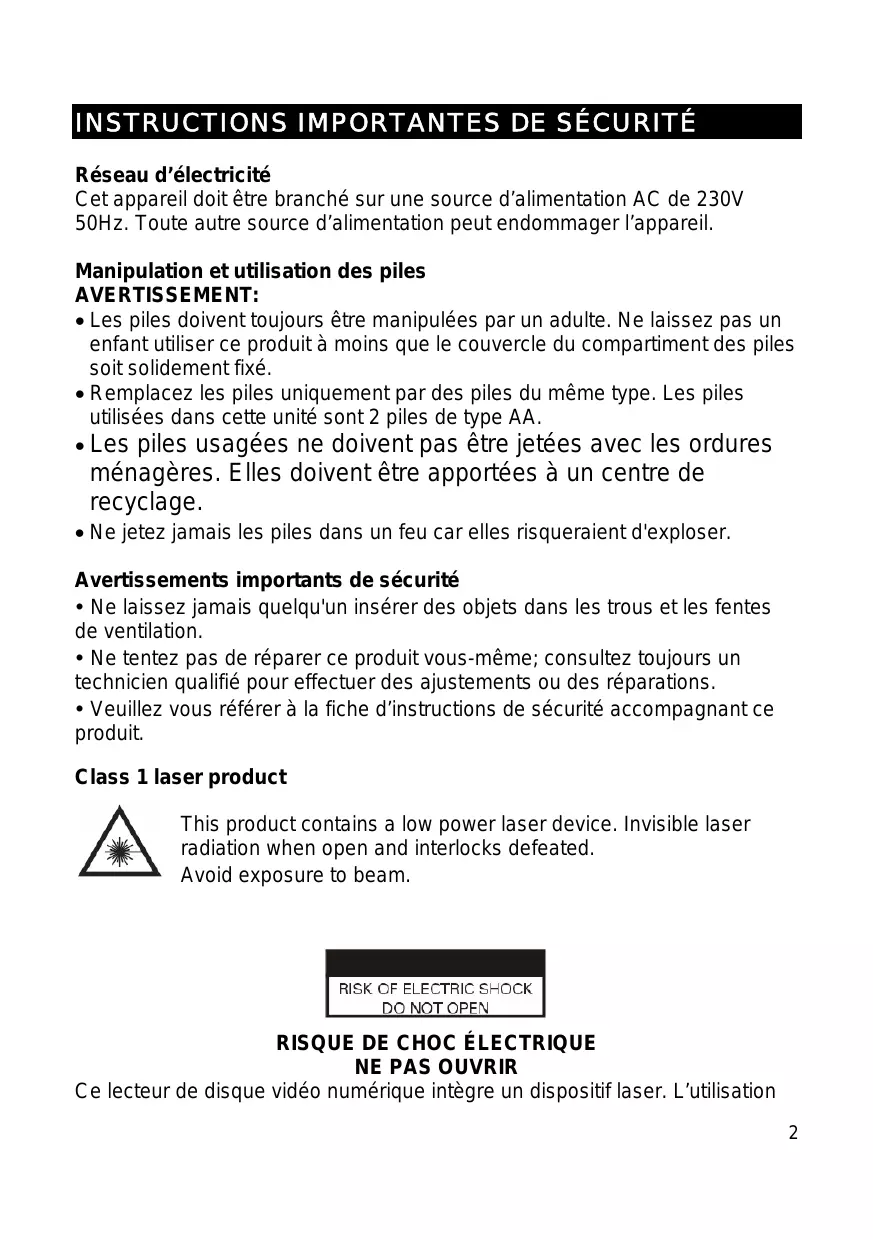 - Ne jetez jamais les piles dans un feu car elles risqueraient d'exploser. Avertissements importants de sécurité y Ne laissez jamais quelqu'un insérer des objets dans les trous et les fentes de ventilation. y Ne tentez pas de réparer ce produit vous-même; consultez toujours un technicien qualifié pour effectuer des ajustements ou des réparations. y Veuillez vous référer à la fiche d’instructions de sécurité accompagnant ce produit. Class 1 laser product This product contains a low power laser device. Invisible laser radiation when open and interlocks defeated. Avoid exposure to beam.