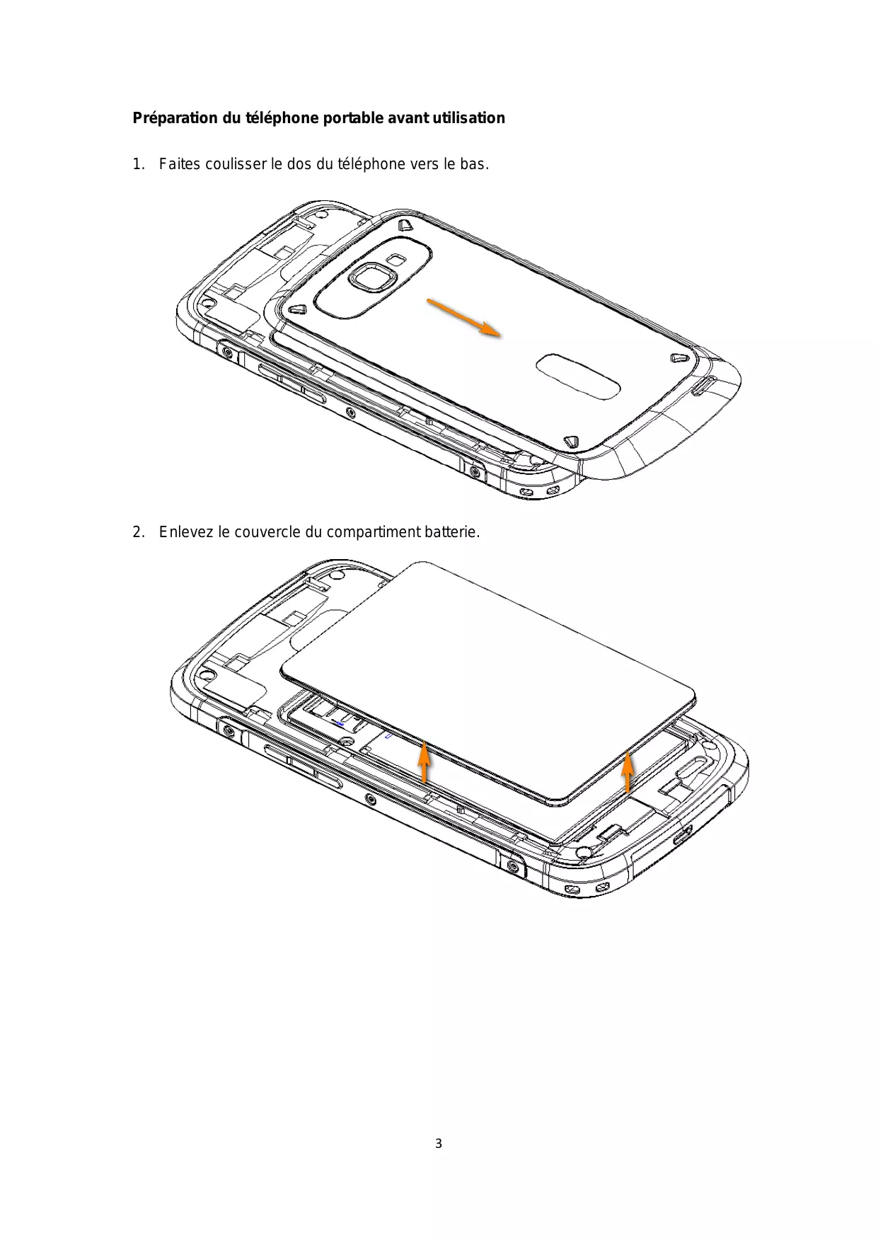 Préparation du téléphone portable avant utilisation 1. Faites coulisser le dos du téléphone vers le bas.