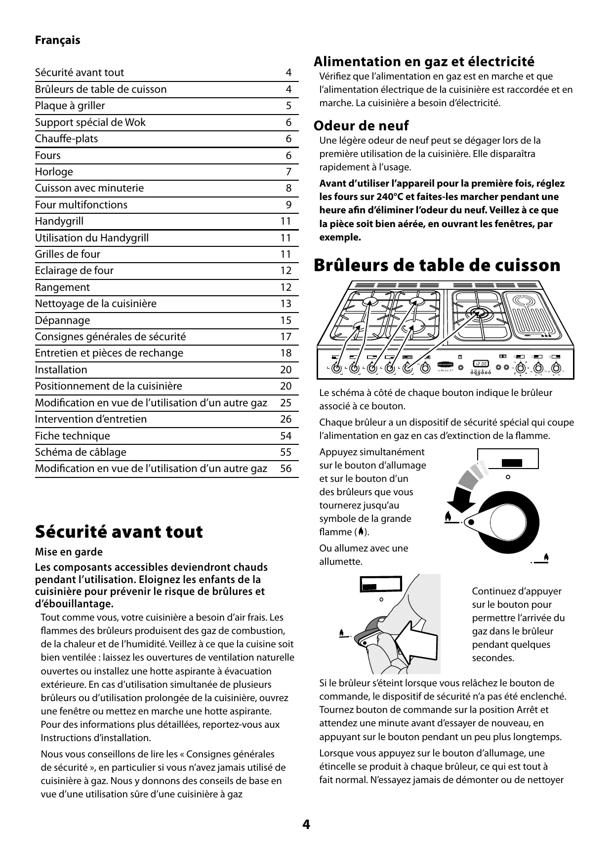 Vérifiez que l’alimentation en gaz est en marche et que l’alimentation électrique de la cuisinière est raccordée et en marche. La cuisinière a besoin d’électricité. Odeur de neuf Une légère odeur de neuf peut se dégager lors de la première utilisation de la cuisinière. Elle disparaîtra rapidement à l’usage. Avant d’utiliser l’appareil pour la première fois, réglez les fours sur 240°C et faites-les marcher pendant une heure afin d’éliminer l’odeur du neuf. Veillez à ce que la pièce soit bien aérée, en ouvrant les fenêtres, par exemple. Brûleurs de table de cuisson Le schéma à côté de chaque bouton indique le brûleur associé à ce bouton. Chaque brûleur a un dispositif de sécurité spécial qui coupe l’alimentation en gaz en cas d’extinction de la flamme. Appuyez simultanément sur le bouton d’allumage et sur le bouton d’un des brûleurs que vous tournerez jusqu’au symbole de la grande flamme ( ). Sécurité avant tout Ou allumez avec une allumette. Mise en garde Les composants accessibles deviendront chauds pendant l’utilisation. Eloignez les enfants de la cuisinière pour prévenir le risque de brûlures et d’ébouillantage. Continuez d’appuyer sur le bouton pour permettre l’arrivée du gaz dans le brûleur pendant quelques secondes. Tout comme vous, votre cuisinière a besoin d’air frais. Les flammes des brûleurs produisent des gaz de combustion, de la chaleur et de l’humidité. Veillez à ce que la cuisine soit bien ventilée : laissez les ouvertures de ventilation naturelle ouvertes ou installez une hotte aspirante à évacuation extérieure. En cas d’utilisation simultanée de plusieurs brûleurs ou d’utilisation prolongée de la cuisinière, ouvrez une fenêtre ou mettez en marche une hotte aspirante. Pour des informations plus détaillées, reportez-vous aux Instructions d’installation. Si le brûleur s’éteint lorsque vous relâchez le bouton de commande, le dispositif de sécurité n’a pas été enclenché. Tournez bouton de commande sur la position Arrêt et attendez une minute avant d’essayer de nouveau, en appuyant sur le bouton pendant un peu plus longtemps. Lorsque vous appuyez sur le bouton d’allumage, une étincelle se produit à chaque brûleur, ce qui est tout à fait normal. N’essayez jamais de démonter ou de nettoyer Nous vous conseillons de lire les « Consignes générales de sécurité », en particulier si vous n’avez jamais utilisé de cuisinière à gaz. Nous y donnons des conseils de base en vue d’une utilisation sûre d’une cuisinière à gaz