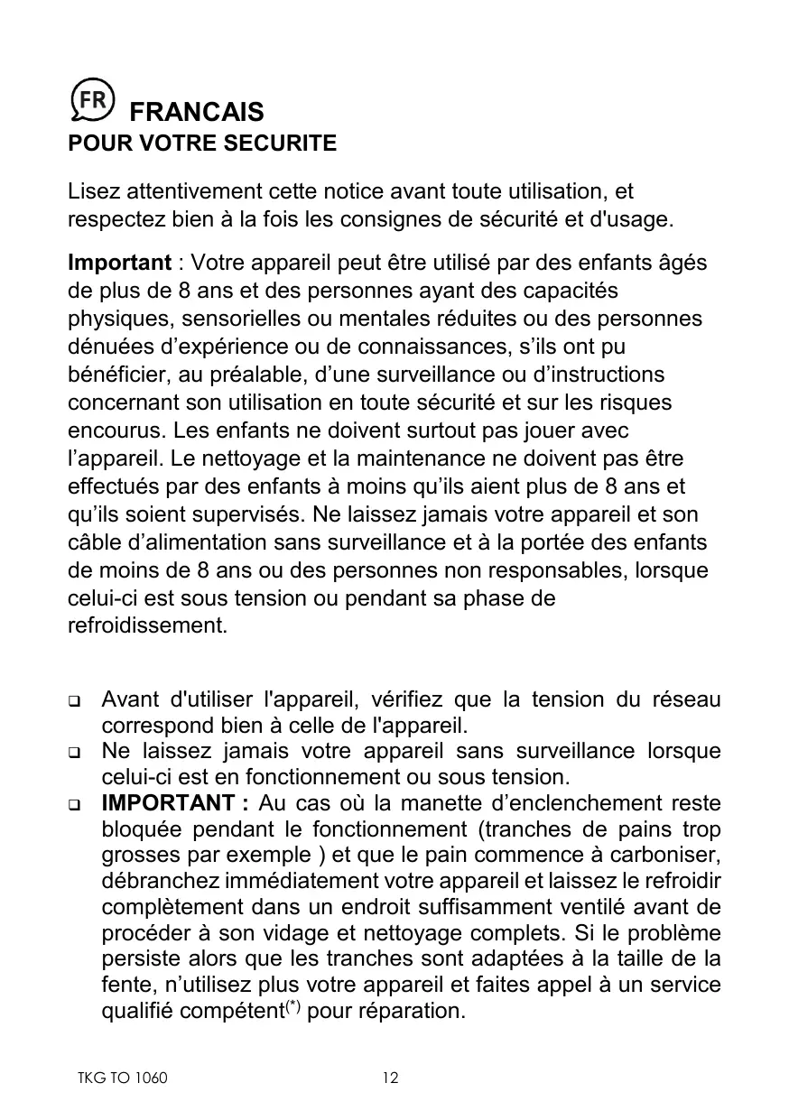 Avant d'utiliser l'appareil, vérifiez que la tension du réseau correspond bien à celle de l'appareil. Ne laissez jamais votre appareil sans surveillance lorsque celui-ci est en fonctionnement ou sous tension. IMPORTANT : Au cas où la manette d’enclenchement reste bloquée pendant le fonctionnement (tranches de pains trop grosses par exemple ) et que le pain commence à carboniser, débranchez immédiatement votre appareil et laissez le refroidir complètement dans un endroit suffisamment ventilé avant de procéder à son vidage et nettoyage complets. Si le problème persiste alors que les tranches sont adaptées à la taille de la fente, n’utilisez plus votre appareil et faites appel à un service qualifié compétent(*) pour réparation. TKG TO 1060