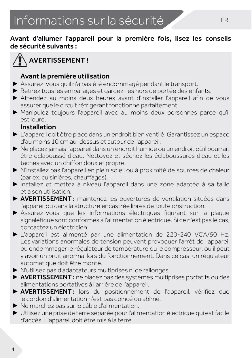 être éclaboussé d'eau. Nettoyez et séchez les éclaboussures d'eau et les taches avec un chiffon doux et propre. ► N’installez pas l'appareil en plein soleil ou à proximité de sources de chaleur (par ex. cuisinières, chauffages). ► Installez et mettez à niveau l'appareil dans une zone adaptée à sa taille et à son utilisation. ► AVERTISSEMENT : maintenez les ouvertures de ventilation situées dans l'appareil ou dans la structure encastrée libres de toute obstruction. ► Assurez-vous que les informations électriques figurant sur la plaque signalétique sont conformes à l'alimentation électrique. Si ce n'est pas le cas, contactez un électricien. ► L'appareil est alimenté par une alimentation de 220-240 VCA/50 Hz. Les variations anormales de tension peuvent provoquer l'arrêt de l'appareil ou endommager le régulateur de température ou le compresseur, ou il peut y avoir un bruit anormal lors du fonctionnement. Dans ce cas, un régulateur automatique doit être monté. ► N'utilisez pas d'adaptateurs multiprises ni de rallonges. ► AVERTISSEMENT : ne placez pas des systèmes multiprises portatifs ou des alimentations portatives à l’arrière de l’appareil. ► AVERTISSEMENT : lors du positionnement de l’appareil, vérifiez que le cordon d’alimentation n’est pas coincé ou abîmé. ► Ne marchez pas sur le câble d'alimentation. ► Utilisez une prise de terre séparée pour l'alimentation électrique qui est facile d'accès. L'appareil doit être mis à la terre.