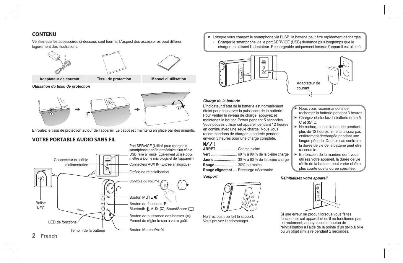 Samsung sera susceptible d'offrir dans le futuroit des mises a niveau pour le micrologiciel du système Portable Audio Sans fil. Si une mise a niveau est offerte, vous pouvezmettre le micrologiciel a niveenu connectant un lecteur USB contenant la mise a niveau du micrologiciel au port SERVICE (USB) de suaure Portable Audio S