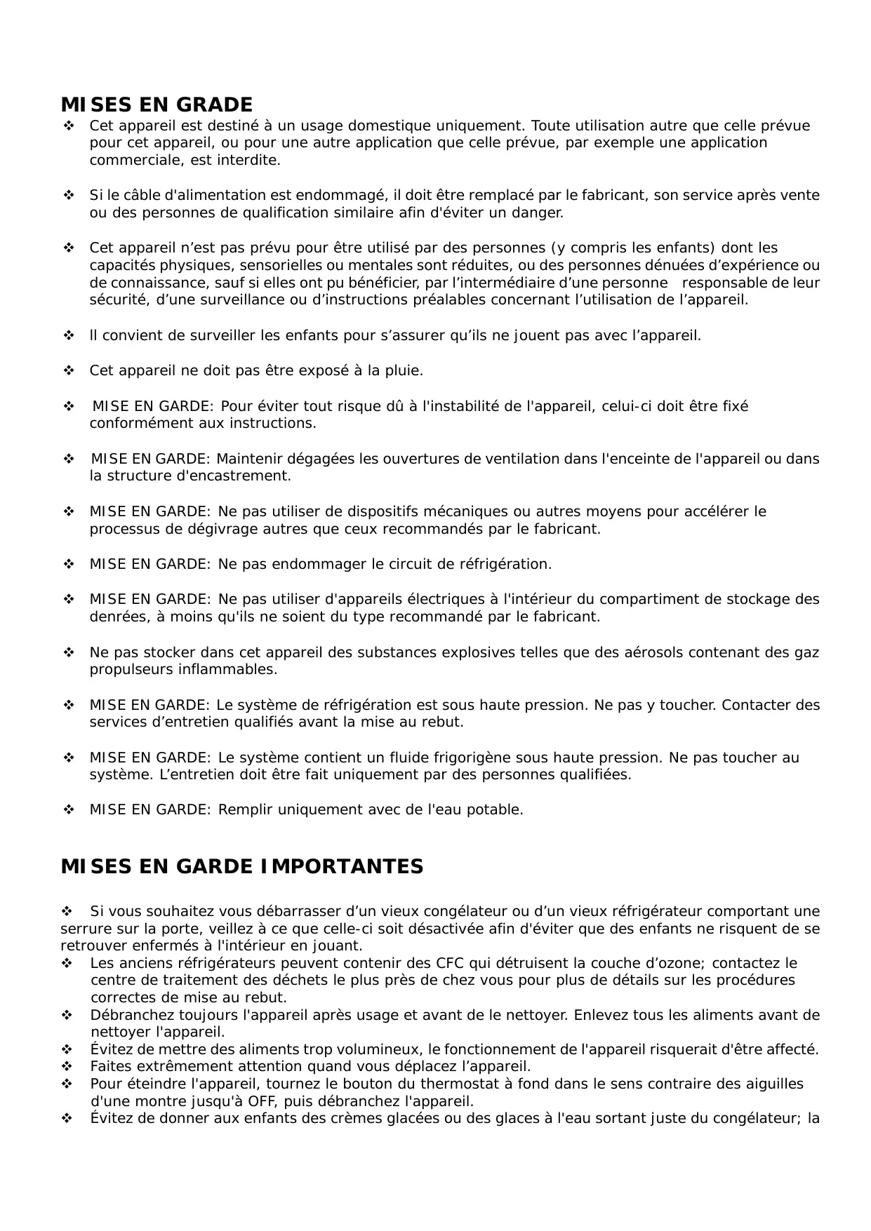 MISES EN GARDE IMPORTANTES