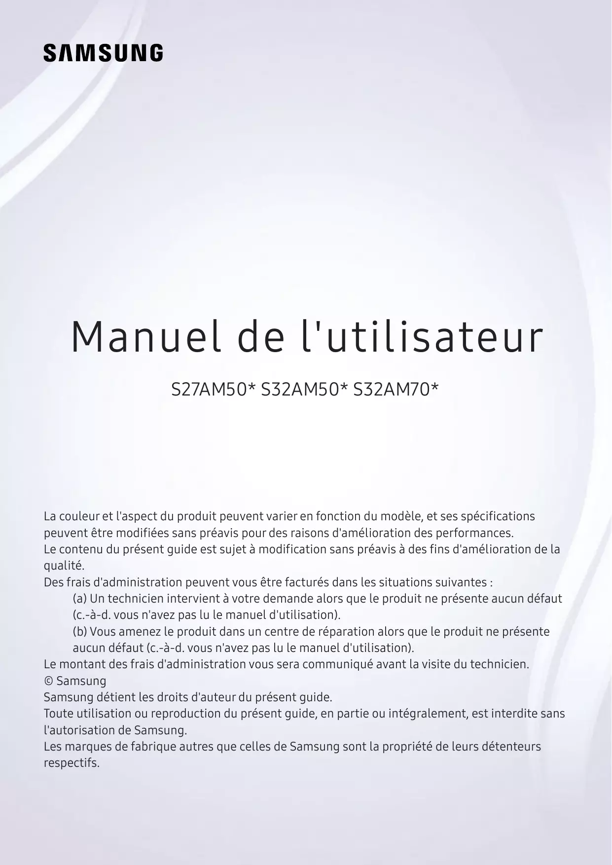 Manuel de l'utilisateur S27AM50* S32AM50* S32AM70* La couleur et l'aspect du produit peuvent varier en fonction du modèle, et ses spécifications peuvent être modifiées sans préavis pour des raisons d'amélioration des performances. Le contenu du présent guide est sujet à modification sans préavis à des fins d'amélioration de la qualité. Des frais d'administration peuvent vous être facturés dans les situations suivantes : (a) Un technicien intervient à votre demande alors que le produit ne présente aucun défaut (c.-à-d. vous n'avez pas lu le manuel d'utilisation). (b) Vous amenez le produit dans un centre de réparation alors que le produit ne présente aucun défaut (c.-à-d. vous n'avez pas lu le manuel d'utilisation). Le montant des frais d'administration vous sera communiqué avant la visite du technicien. © Samsung Samsung détient les droits d'auteur du présent guide. Toute utilisation ou reproduction du présent guide, en partie ou intégralement, est interdite sans l'autorisation de Samsung. Les marques de fabrique autres que celles de Samsung sont la propriété de leurs détenteurs respectifs. Contenu Avant utilisation du produit Consignes de sécurité