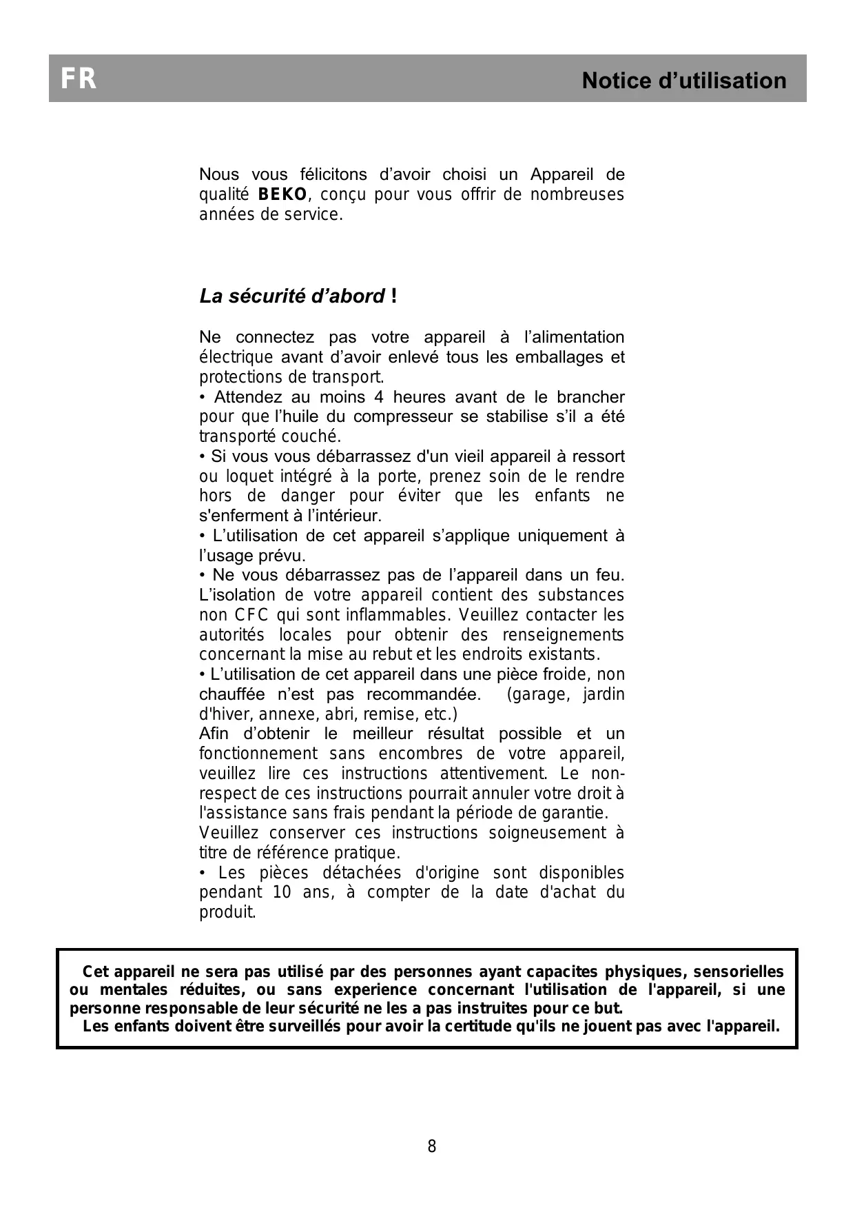 La sécurité d’abord ! Ne connectez pas votre appareil à l’alimentation électrique avant d’avoir enlevé tous les emballages et protections de transport. • Attendez au moins 4 heures avant de le brancher pour que l’huile du compresseur se stabilise s’il a été transporté couché. • Si vous vous débarrassez d'un vieil appareil à ressort ou loquet intégré à la porte, prenez soin de le rendre hors de danger pour éviter que les enfants ne s'enferment à l’intérieur. • L’utilisation de cet appareil s’applique uniquement à l’usage prévu. • Ne vous débarrassez pas de l’appareil dans un feu. L’isolation de votre appareil contient des substances non CFC qui sont inflammables. Veuillez contacter les autorités locales pour obtenir des renseignements concernant la mise au rebut et les endroits existants. • L’utilisation de cet appareil dans une pièce froide, non chauffée n’est pas recommandée. (garage, jardin d'hiver, annexe, abri, remise, etc.) Afin d’obtenir le meilleur résultat possible et un fonctionnement sans encombres de votre appareil, veuillez lire ces instructions attentivement. Le nonrespect de ces instructions pourrait annuler votre droit à l'assistance sans frais pendant la période de garantie. Veuillez conserver ces instructions soigneusement à titre de référence pratique. • Les pièces détachées d'origine sont disponibles pendant 10 ans, à compter de la date d'achat du produit.