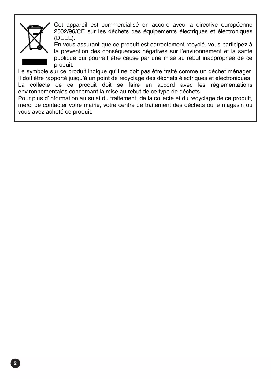Cet apparéil est commercialisé en accord avec la directive européenne 2002/96/CE sur les déchets des équipements électriques et électroniques (DEEE).