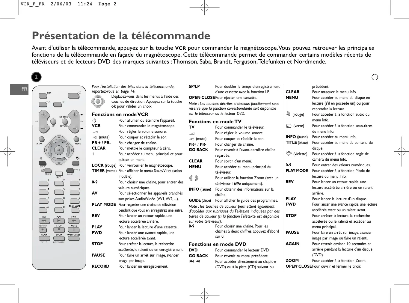 2/06/03 11:24 Page 2 Présentation de la télécommande Avant d’utiliser la télécommande, appuyez sur la touche VCR pour commander le magnétoscope.Vous pouvez retrouver les principales fonctions de la télécommande en façade du magnétoscope. Cette télécommande permet de commander certains modèles récents de téléviseurs et de lecteurs DVD des marques suivantes :Thomson, Saba, Brandt, Ferguson,Telefunken et Nordmende.