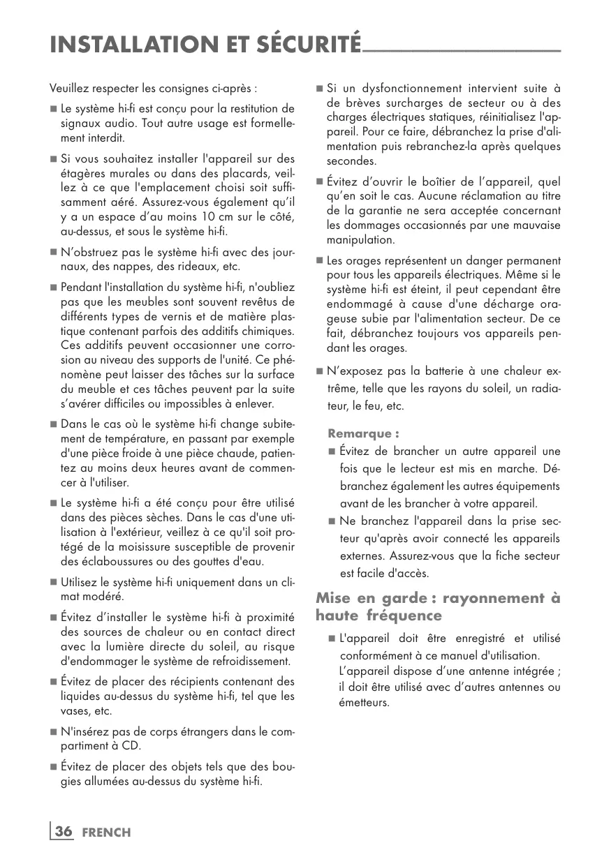 SUOMI 99-113 POLSKI 114-130 INSTALLATION ET SÉCURITÉ------------------------------------------------------------------Veuillez respecter les consignes ci-après : Le système hi-fi est conçu pour la restitution de signaux audio. Tout autre usage est formellement interdit.