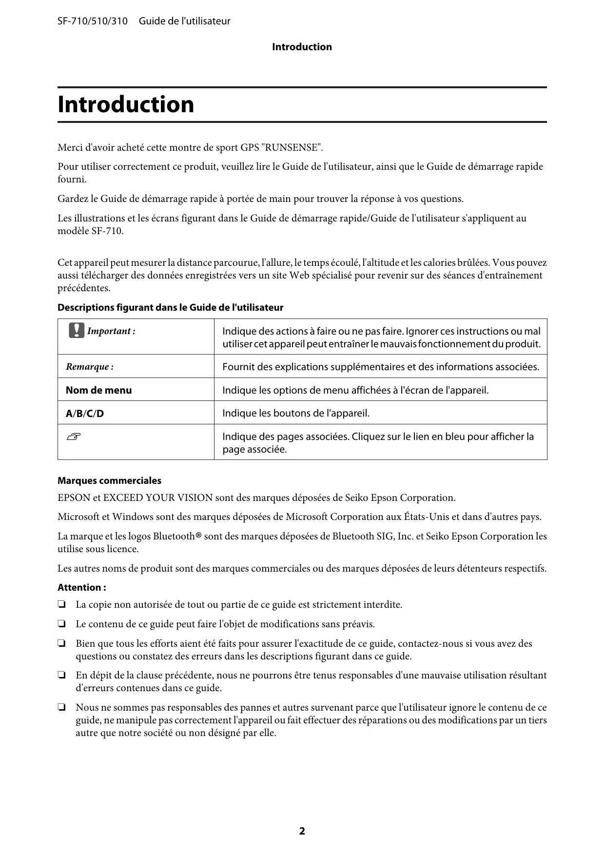 SF-710/510/310 Guide de l'utilisateur Introduction Introduction Merci d'avoir acheté cette montre de sport GPS "RUNSENSE". Pour utiliser correctement ce produit, veuillez lire le Guide de l'utilisateur, ainsi que le Guide de démarrage rapide fourni. Gardez le Guide de démarrage rapide à portée de main pour trouver la réponse à vos questions. Les illustrations et les écrans figurant dans le Guide de démarrage rapide/Guide de l'utilisateur s'appliquent au modèle SF-710. Cet appareil peut mesurer la distance parcourue, l'allure, le temps écoulé, l'altitude et les calories brûlées. Vous pouvez aussi télécharger des données enregistrées vers un site Web spécialisé pour revenir sur des séances d'entraînement précédentes. Descriptions figurant dans le Guide de l'utilisateur c Important : Indique des actions à faire ou ne pas faire. Ignorer ces instructions ou mal utiliser cet appareil peut entraîner le mauvais fonctionnement du produit. Remarque : Fournit des explications supplémentaires et des informations associées. Nom de menu Indique les options de menu affichées à l'écran de l'appareil. A/B/C/D Indique les boutons de l'appareil.