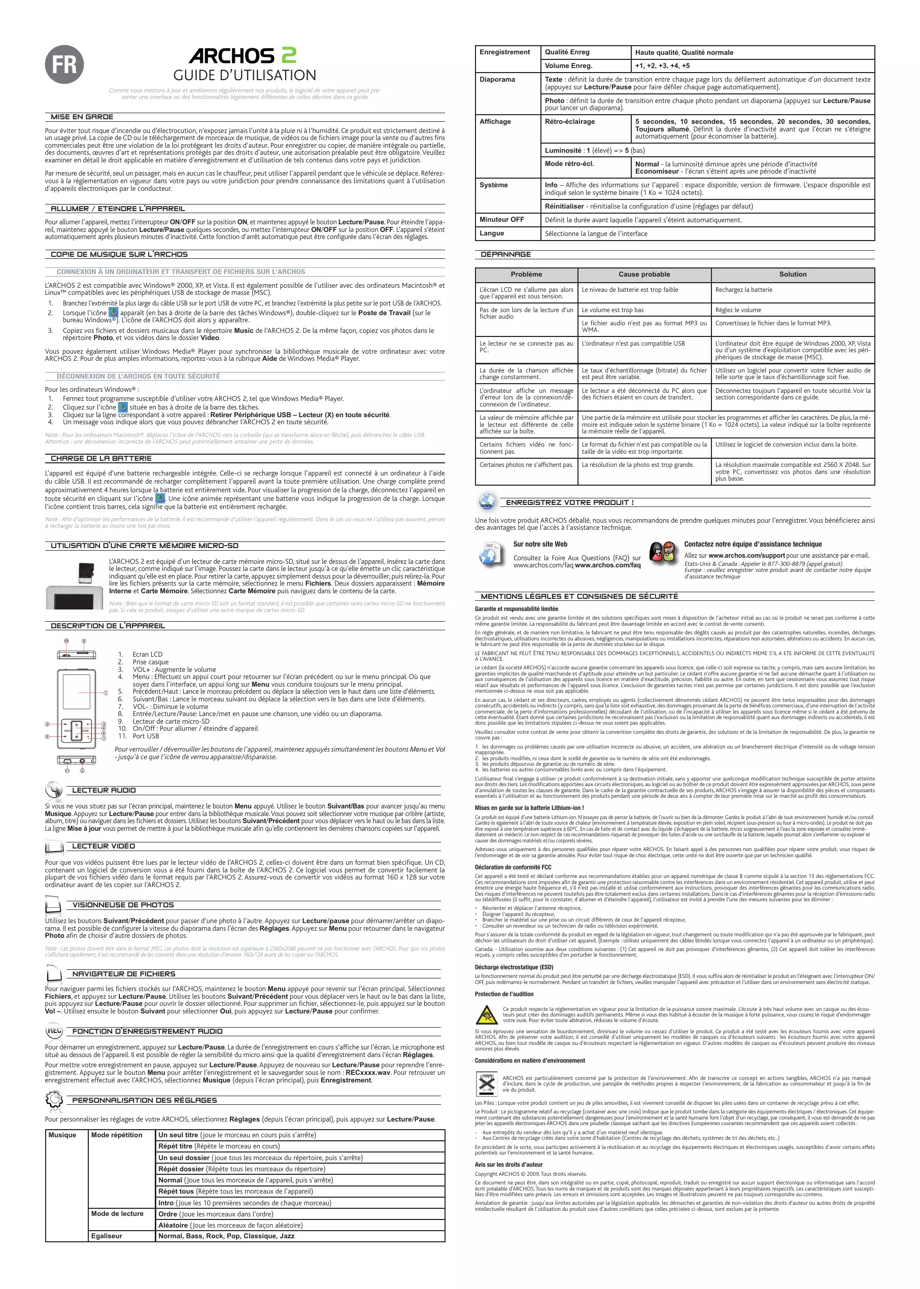 Pour personnaliser les réglages de votre ARCHOS, sélectionnez Réglages (depuis l’écran principal), puis appuyez sur Lecture/Pause. Réglez le volume Convertissez le fichier dans le format MP3. Le lecteur ne se connecte pas au PC. L’ordinateur n’est pas compatible USB L’ordinateur doit être équipé de Windows 2000, XP, Vista ou d’un système d’exploitation compatible avec les périphériques de stockage de masse (MSC). La durée de la chanson affichée change constamment. Le taux d’échantillonnage (bitrate) du fichier est peut être variable. Utilisez un logiciel pour convertir votre fichier audio de telle sorte que le taux d’échantillonnage soit fixe. L’ordinateur affiche un message d’erreur lors de la connexion/déconnexion de l’ordinateur. Le lecteur a été déconnecté du PC alors que des fichiers étaient en cours de transfert. Déconnectez toujours l’appareil en toute sécurité. Voir la section correspondante dans ce guide. La valeur de mémoire affichée par le lecteur est différente de celle affichée sur la boîte. Une partie de la mémoire est utilisée pour stocker les programmes et afficher les caractères. De plus, la mémoire est indiquée selon le système binaire (1 Ko = 1024 octets). La valeur indiqué sur la boîte représente la mémoire réelle de l’appareil. Certains fichiers vidéo ne fonctionnent pas. Le format du fichier n’est pas compatible ou la taille de la vidéo est trop importante. Utilisez le logiciel de conversion inclus dans la boite. Certaines photos ne s’affichent pas. La résolution de la photo est trop grande. La résolution maximale compatible est 2560 X 2048. Sur votre PC, convertissez vos photos dans une résolution plus basse. ENREGISTREZ VOTRE PRODUIT ! Sur notre site Web Consultez la Foire Aux Questions (FAQ) sur www.archos.com/faq www.archos.com/faq Contactez notre équipe d’assistance technique Allez sur www.archos.com/support pour une assistance par e-mail. Etats-Unis & Canada : Appeler le 877-300-8879 (appel gratuit) Europe : veuillez enregistrer votre produit avant de contacter notre équipe d’assistance technique MENTIONS LÉGALES ET CONSIGNES DE SÉCURITÉ Garantie et responsabilité limitée Ce produit est vendu avec une garantie limitée et des solutions spécifiques sont mises à disposition de l’acheteur initial au cas où le produit ne serait pas conforme à cette même garantie limitée. La responsabilité du fabricant peut être davantage limitée en accord avec le contrat de vente consenti. En règle générale, et de manière non limitative, le fabricant ne peut être tenu responsable des dégâts causés au produit par des catastrophes naturelles, incendies, décharges électrostatiques, utilisations incorrectes ou abusives, négligences, manipulations ou installations incorrectes, réparations non autorisées, altérations ou accidents. En aucun cas, le fabricant ne peut être responsable de la perte de données stockées sur le disque. LE FABRICANT NE PEUT ÊTRE TENU RESPONSABLE DES DOMMAGES EXCEPTIONNELS, ACCIDENTELS OU INDIRECTS MEME S’IL A ETE INFORME DE CETTE EVENTUALITE A L’AVANCE. Le cédant (la société ARCHOS) n’accorde aucune garantie concernant les appareils sous licence, que celle-ci soit expresse ou tacite, y compris, mais sans aucune limitation, les garanties implicites de qualité marchande et d’aptitude pour atteindre un but particulier. Le cédant n’offre aucune garantie ni ne fait aucune démarche quant à l’utilisation ou aux conséquences de l’utilisation des appareils sous licence en matière d’exactitude, précision, fiabilité ou autre. En outre, en tant que cessionnaire vous assumez tout risque relatif aux résultats et performances de l’appareil sous licence. L’exclusion de garanties tacites n’est pas permise par certaines juridictions. Il est donc possible que l’exclusion mentionnée ci-dessus ne vous soit pas applicable. En aucun cas, le cédant et ses directeurs, cadres, employés ou agents (collectivement dénommés cédant ARCHOS) ne peuvent être tenus responsables pour des dommages consécutifs, accidentels ou indirects (y compris, sans que la liste soit exhaustive, des dommages provenant de la perte de bénéfices commerciaux, d’une interruption de l’activité commerciale, de la perte d’informations professionnelles) découlant de l’utilisation, ou de l’incapacité à utiliser les appareils sous licence même si le cédant a été prévenu de cette éventualité. Étant donné que certaines juridictions ne reconnaissent pas l’exclusion ou la limitation de responsabilité quant aux dommages indirects ou accidentels, il est donc possible que les limitations stipulées ci-dessus ne vous soient pas applicables. Veuillez consulter votre contrat de vente pour obtenir la convention complète des droits de garantie, des solutions et de la limitation de responsabilité. De plus, la garantie ne couvre pas : 1. les dommages ou problèmes causés par une utilisation incorrecte ou abusive, un accident, une altération ou un branchement électrique d’intensité ou de voltage tension inappropriée.