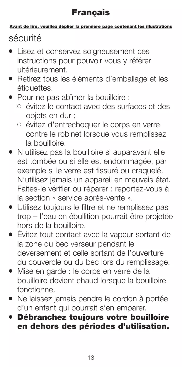 Il est recommandé de n'utiliser la bouilloire que pour de l'eau. L'utilisation d'autres liquides peut endommager l'appareil et annuler la garantie.