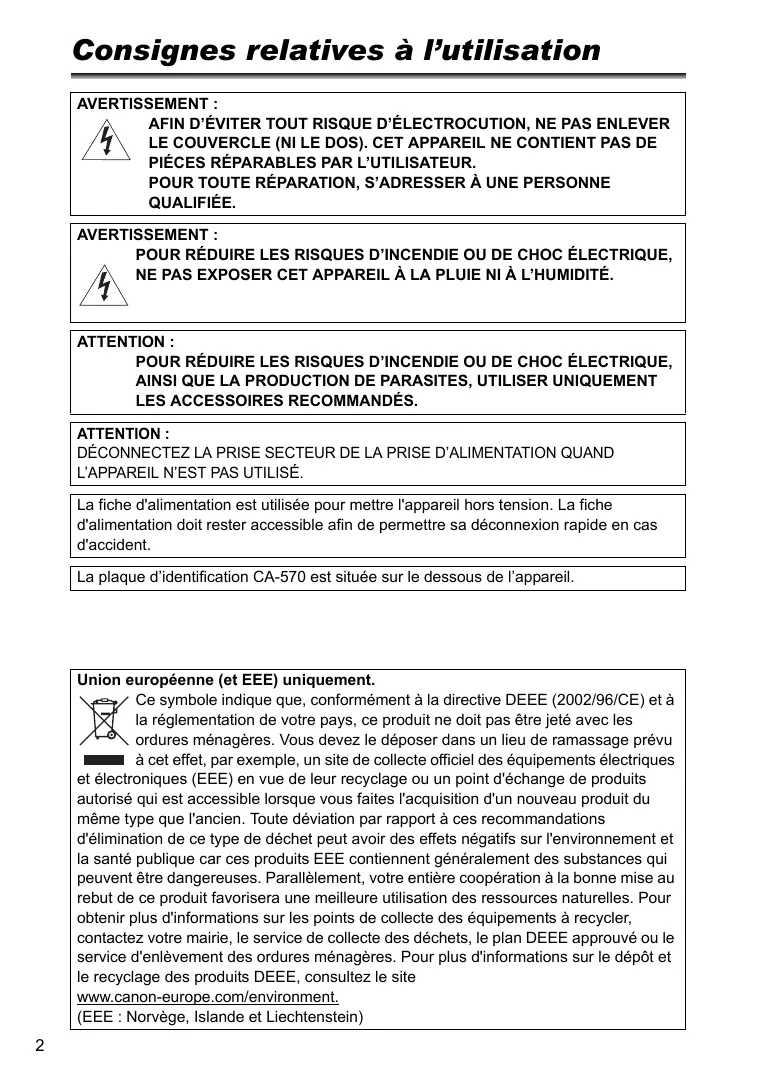 POUR RÉDUIRE LES RISQUES D’INCENDIE OU DE CHOC ÉLECTRIQUE, NE PAS EXPOSER CET APPAREIL À LA PLUIE NI À L’HUMIDITÉ. ATTENTION : POUR RÉDUIRE LES RISQUES D’INCENDIE OU DE CHOC ÉLECTRIQUE, AINSI QUE LA PRODUCTION DE PARASITES, UTILISER UNIQUEMENT LES ACCESSOIRES RECOMMANDÉS. ATTENTION : DÉCONNECTEZ LA PRISE SECTEUR DE LA PRISE D’ALIMENTATION QUAND L’APPAREIL N’EST PAS UTILISÉ. La fiche d'alimentation est utilisée pour mettre l'appareil hors tension. La fiche d'alimentation doit rester accessible afin de permettre sa déconnexion rapide en cas d'accident. La plaque d’identification CA-570 est située sur le dessous de l’appareil. Union européenne (et EEE) uniquement. Ce symbole indique que, conformément à la directive DEEE (2002/96/CE) et à la réglementation de votre pays, ce produit ne doit pas être jeté avec les ordures ménagères. Vous devez le déposer dans un lieu de ramassage prévu à cet effet, par exemple, un site de collecte officiel des équipements électriques et électroniques (EEE) en vue de leur recyclage ou un point d'échange de produits autorisé qui est accessible lorsque vous faites l'acquisition d'un nouveau produit du même type que l'ancien. Toute déviation par rapport à ces recommandations d'élimination de ce type de déchet peut avoir des effets négatifs sur l'environnement et la santé publique car ces produits EEE contiennent généralement des substances qui peuvent être dangereuses. Parallèlement, votre entière coopération à la bonne mise au rebut de ce produit favorisera une meilleure utilisation des ressources naturelles. Pour obtenir plus d'informations sur les points de collecte des équipements à recycler, contactez votre mairie, le service de collecte des déchets, le plan DEEE approuvé ou le service d'enlèvement des ordures ménagères. Pour plus d'informations sur le dépôt et le recyclage des produits DEEE, consultez le site www.canon-europe.com/environment. (EEE : Norvège, Islande et Liechtenstein)