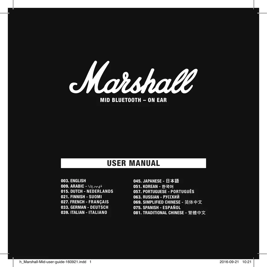 2016-09-21 10:23 Marshall est une marque de Marshall Amplification Plc. Autorisation accordée. La conception du produit et de l’emballage sont des propriétés intellectuelles de Zound Industries International AB. © 2016 Zound Industries. Tous droits réservés. Produit en Chine. Zound Industries International AB ne garantit pas la compatibilité du microphone et de la télécommande avec tous les appareils mobiles. Conçu pour les téléphones portables utilisant une prise de 3,5 mm standard bidirectionnelle non protégée. Zound Industries International AB • Centralplan 15 • 111 20 Stockholm • Suède Le nom et les logos Bluetooth® sont des marques déposées de Bluetooth SIG, Inc. Toute utilisation desdites marques par Zound Industries International AB est autorisée.