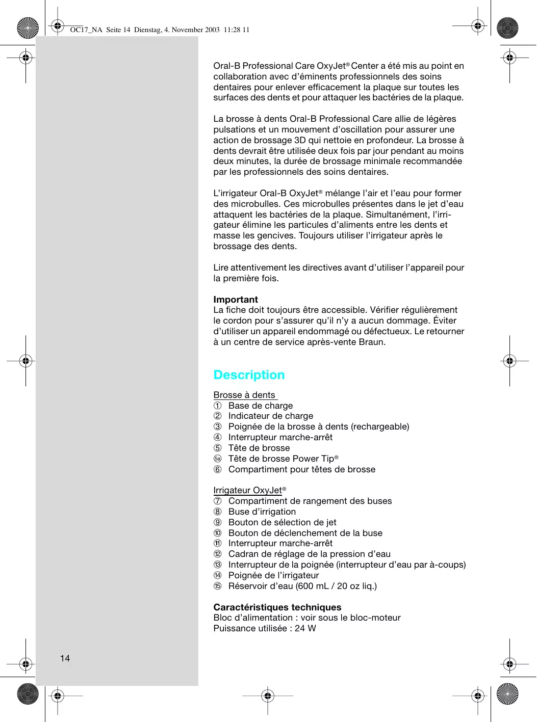 OC17_NA Seite 14 Dienstag, 4. November 2003 11:28 11 Oral-B Professional Care OxyJet® Center a été mis au point en collaboration avec d’éminents professionnels des soins dentaires pour enlever efficacement la plaque sur toutes les surfaces des dents et pour attaquer les bactéries de la plaque. La brosse à dents Oral-B Professional Care allie de légères pulsations et un mouvement d’oscillation pour assurer une action de brossage 3D qui nettoie en profondeur. La brosse à dents devrait être utilisée deux fois par jour pendant au moins deux minutes, la durée de brossage minimale recommandée par les professionnels des soins dentaires. L’irrigateur Oral-B OxyJet ® mélange l’air et l’eau pour former des microbulles. Ces microbulles présentes dans le jet d’eau attaquent les bactéries de la plaque. Simultanément, l’irrigateur élimine les particules d’aliments entre les dents et masse les gencives. Toujours utiliser l’irrigateur après le brossage des dents. Lire attentivement les directives avant d’utiliser l’appareil pour la première fois. Important La fiche doit toujours être accessible. Vérifier régulièrement le cordon pour s’assurer qu’il n’y a aucun dommage. Éviter d’utiliser un appareil endommagé ou défectueux. Le retourner à un centre de service après-vente Braun. Description Brosse à dents 1 Base de charge 2 Indicateur de charge 3 Poignée de la brosse à dents (rechargeable) 4 Interrupteur marche-arrêt 5 Tête de brosse E Tête de brosse Power Tip® 6 Compartiment pour têtes de brosse Irrigateur OxyJet® Compartiment de rangement des buses Buse d’irrigation Bouton de sélection de jet Bouton de déclenchement de la buse Interrupteur marche-arrêt Cadran de réglage de la pression d’eau Interrupteur de la poignée (interrupteur d’eau par à-coups) Poignée de l’irrigateur Réservoir d’eau (600 mL / 20 oz liq.)