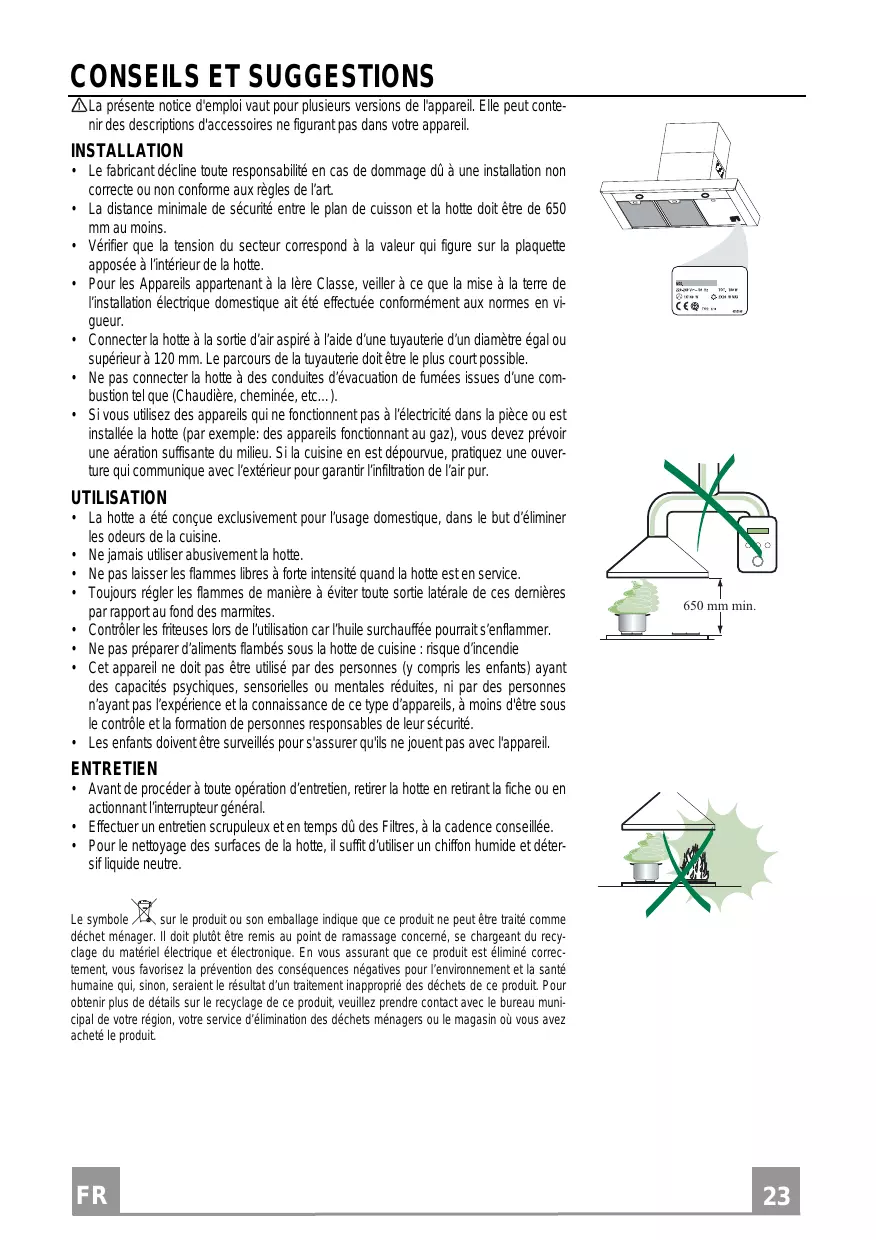 - La distance minimale de sécurité entre le plan de cuisson et la hotte doit être de 650 mm au moins.
