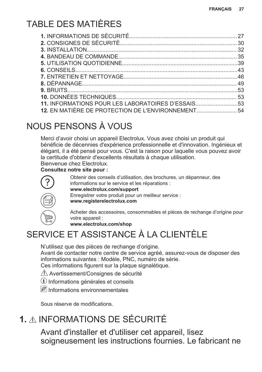 TABLE DES MATIÈRES 1. INFORMATIONS DE SÉCURITÉ 27 2. CONSIGNES DE SÉCURITÉ 30 3. INSTALLATION 32 4. BANDEAU DE COMMANDE 35 5. UTILISATION QUOTIDIENNE39 6. CONSEILS43 7. ENTRETIEN ET NETTOYAGE46 8. DÉPANNAGE 49 9. BRUITS53 10. DONNÉES TECHNIQUES 53 11. INFORMATIONS POUR LES LABORATOIRES D’ESSAIS53 12. EN MATIÈRE DE PROTECTION DE L'ENVIRONNEMENT 54