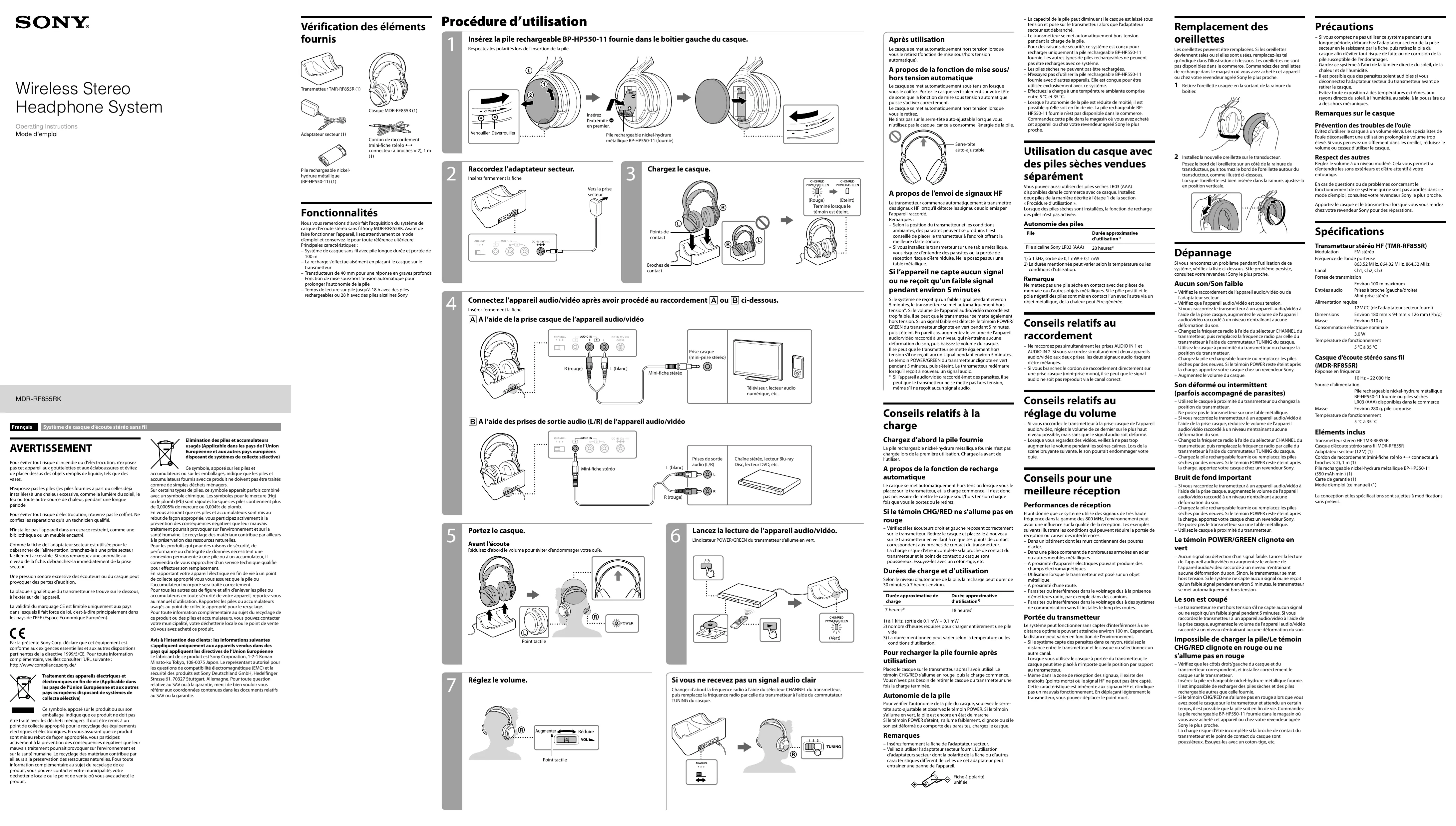 Installez la nouvelle oreillette sur le transducteur. Posez le bord de l’oreillette sur un côté de la rainure du transducteur, puis tournez le bord de l’oreillette autour du transducteur, comme illustré ci-dessous. Lorsque l’oreillette est bien insérée dans la rainure, ajustez-la en position verticale. Respect des autres Réglez le volume à un niveau modéré. Cela vous permettra d’entendre les sons extérieurs et d’être attentif à votre entourage. En cas de questions ou de problèmes concernant le fonctionnement de ce système qui ne sont pas abordés dans ce mode d’emploi, consultez votre revendeur Sony le plus proche. Apportez le casque et le transmetteur lorsque vous vous rendez chez votre revendeur Sony pour des réparations. Autonomie des piles Pile Précautions Spécifications Dépannage Si vous rencontrez un problème pendant l’utilisation de ce système, vérifiez la liste ci-dessous. Si le problème persiste, consultez votre revendeur Sony le plus proche. Aucun son/Son faible – Vérifiez le raccordement de l’appareil audio/vidéo ou de l’adaptateur secteur. – Vérifiez que l’appareil audio/vidéo est sous tension. – Si vous raccordez le transmetteur à un appareil audio/vidéo à l’aide de la prise casque, augmentez le volume de l’appareil audio/vidéo raccordé à un niveau n’entraînant aucune déformation du son. – Changez la fréquence radio à l’aide du sélecteur CHANNEL du transmetteur, puis remplacez la fréquence radio par celle du transmetteur à l’aide du commutateur TUNING du casque. – Utilisez le casque à proximité du transmetteur ou changez la position du transmetteur. – Chargez la pile rechargeable fournie ou remplacez les piles sèches par des neuves. Si le témoin POWER reste éteint après la charge, apportez votre casque chez un revendeur Sony. – Augmentez le volume du casque. Son déformé ou intermittent (parfois accompagné de parasites) – Utilisez le casque à proximité du transmetteur ou changez la position du transmetteur. – Ne posez pas le transmetteur sur une table métallique. – Si vous raccordez le transmetteur à un appareil audio/vidéo à l’aide de la prise casque, réduisez le volume de l’appareil audio/vidéo raccordé à un niveau n’entraînant aucune déformation du son. – Changez la fréquence radio à l’aide du sélecteur CHANNEL du transmetteur, puis remplacez la fréquence radio par celle du transmetteur à l’aide du commutateur TUNING du casque. – Chargez la pile rechargeable fournie ou remplacez les piles sèches par des neuves. Si le témoin POWER reste éteint après la charge, apportez votre casque chez un revendeur Sony. Bruit de fond important – Si vous raccordez le transmetteur à un appareil audio/vidéo à l’aide de la prise casque, augmentez le volume de l’appareil audio/vidéo raccordé à un niveau n’entraînant aucune déformation du son. – Chargez la pile rechargeable fournie ou remplacez les piles sèches par des neuves. Si le témoin POWER reste éteint après la charge, apportez votre casque chez un revendeur Sony. – Ne posez pas le transmetteur sur une table métallique. – Utilisez le casque à proximité du transmetteur. Le témoin POWER/GREEN clignote en vert – Aucun signal ou détection d’un signal faible. Lancez la lecture de l’appareil audio/vidéo ou augmentez le volume de l’appareil audio/vidéo raccordé à un niveau n’entraînant aucune déformation du son. Sinon, le transmetteur se met hors tension. Si le système ne capte aucun signal ou ne reçoit qu’un faible signal pendant environ 5 minutes, le transmetteur se met automatiquement hors tension. Le son est coupé – Le transmetteur se met hors tension s’il ne capte aucun signal ou ne reçoit qu’un faible signal pendant 5 minutes. Si vous raccordez le transmetteur à un appareil audio/vidéo à l’aide de la prise casque, augmentez le volume de l’appareil audio/vidéo raccordé à un niveau n’entraînant aucune déformation du son. Impossible de charger la pile/Le témoin CHG/RED clignote en rouge ou ne s’allume pas en rouge – Vérifiez que les côtés droit/gauche du casque et du transmetteur correspondent, et installez correctement le casque sur le transmetteur. – Insérez la pile rechargeable nickel-hydrure métallique fournie. Il est impossible de recharger des piles sèches et des piles rechargeable autres que celle fournie. – Si le témoin CHG/RED ne s’allume pas en rouge alors que vous avez posé le casque sur le transmetteur et attendu un certain temps, il est possible que la pile soit en fin de vie. Commandez la pile rechargeable BP-HP550-11 fournie dans le magasin où vous avez acheté cet appareil ou chez votre revendeur agréé Sony le plus proche. – La charge risque d’être incomplète si la broche de contact du transmetteur et le point de contact du casque sont poussiéreux. Essuyez-les avec un coton-tige, etc. Transmetteur stéréo HF (TMR-RF855R) Modulation FM stéréo Fréquence de l’onde porteuse 863,52 MHz, 864,02 MHz, 864,52 MHz Canal Ch1, Ch2, Ch3 Portée de transmission Environ 100 m maximum Entrées audio Prises à broche (gauche/droite) Mini-prise stéréo Alimentation requise 12 V CC (de l’adaptateur secteur fourni) Dimensions Environ 180 mm × 94 mm × 126 mm (l/h/p) Masse Environ 310 g Consommation électrique nominale 3,0 W Température de fonctionnement 5 °C à 35 °C Casque d’écoute stéréo sans fil (MDR-RF855R) Réponse en fréquence 10 Hz – 22 000 Hz Source d’alimentation Pile rechargeable nickel-hydrure métallique BP-HP550-11 fournie ou piles sèches LR03 (AAA) disponibles dans le commerce Masse Environ 280 g, pile comprise Température de fonctionnement 5 °C à 35 °C Eléments inclus Transmetteur stéréo HF TMR-RF855R Casque d’écoute stéréo sans fil MDR-RF855R Adaptateur secteur (12 V) (1) Cordon de raccordement (mini-fiche stéréo connecteur à broches × 2), 1 m (1) Pile recharg