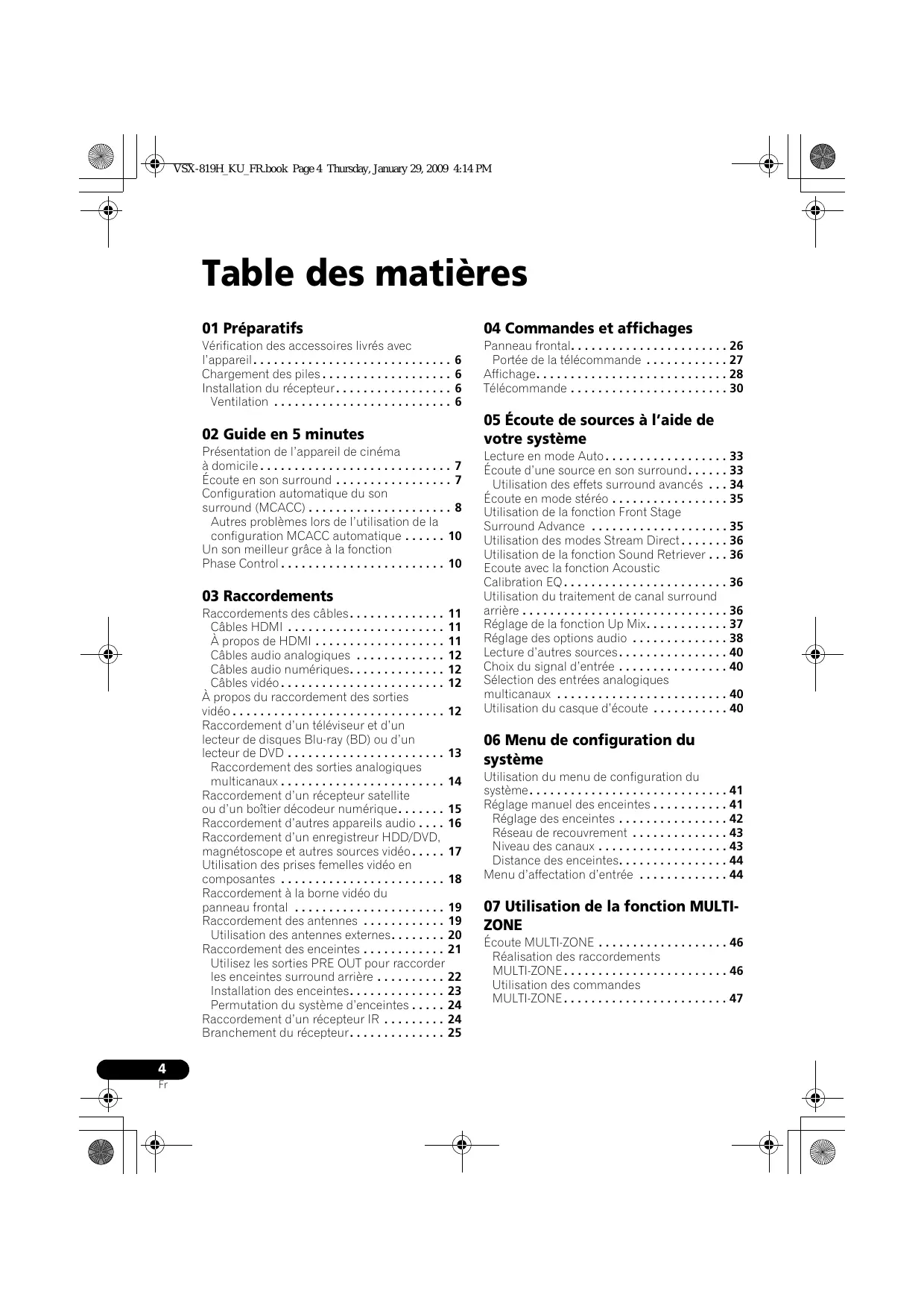 • Discover the benefits of registering your product online at http://www.pioneer.co.uk (or http://www.pioneer.eu). VSX-819H_KU_FR.book Page 4 Thursday, January 29, 2009 4:14 PM Table des matières 01 Préparatifs Vérification des accessoires livrés avec l’appareil Chargement des piles Installation du récepteur