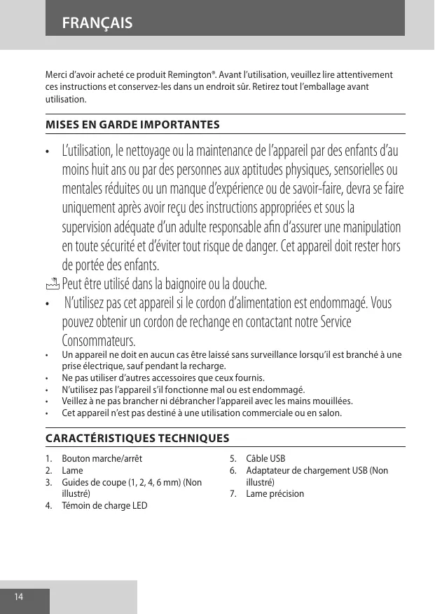 Merci d'avoir acheté ce produit Remington®. Avant l'utilisation, veuillez dire attentivement ces instructions et conservez-les dans un endroit sûr. Retirez tout l'emballage avant utilisation.