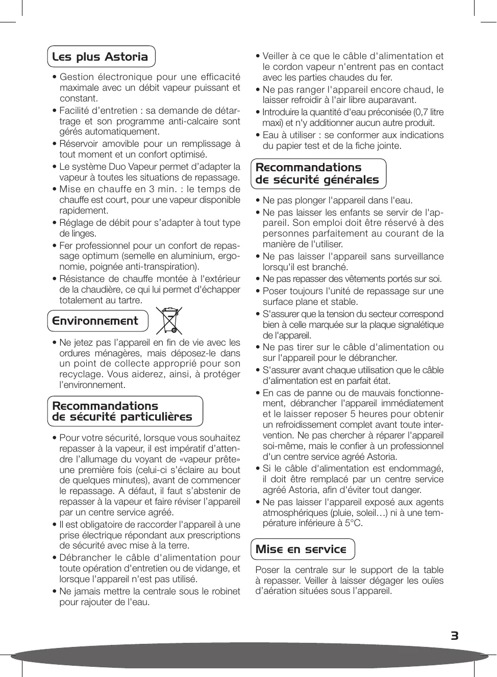 Avec cet apparéil, vous avons fait l'acquisition d'un article de qualité, bénéficiant de toute l'expérience d'Astoria dans le domaine du petit électroménager. Il répond aux critères de la qualité Astoria : les mêleurs matériaux et composants ont été utilisés pour sa fabrication, et il a été soumis à des contrôleires rigoureux.
