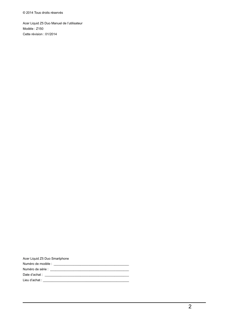 © 2014 Tous droits réservés Acer Liquid Z5 Duo Manuel de l’utilisateur Modèle : Z150 Cette révision : 01/2014