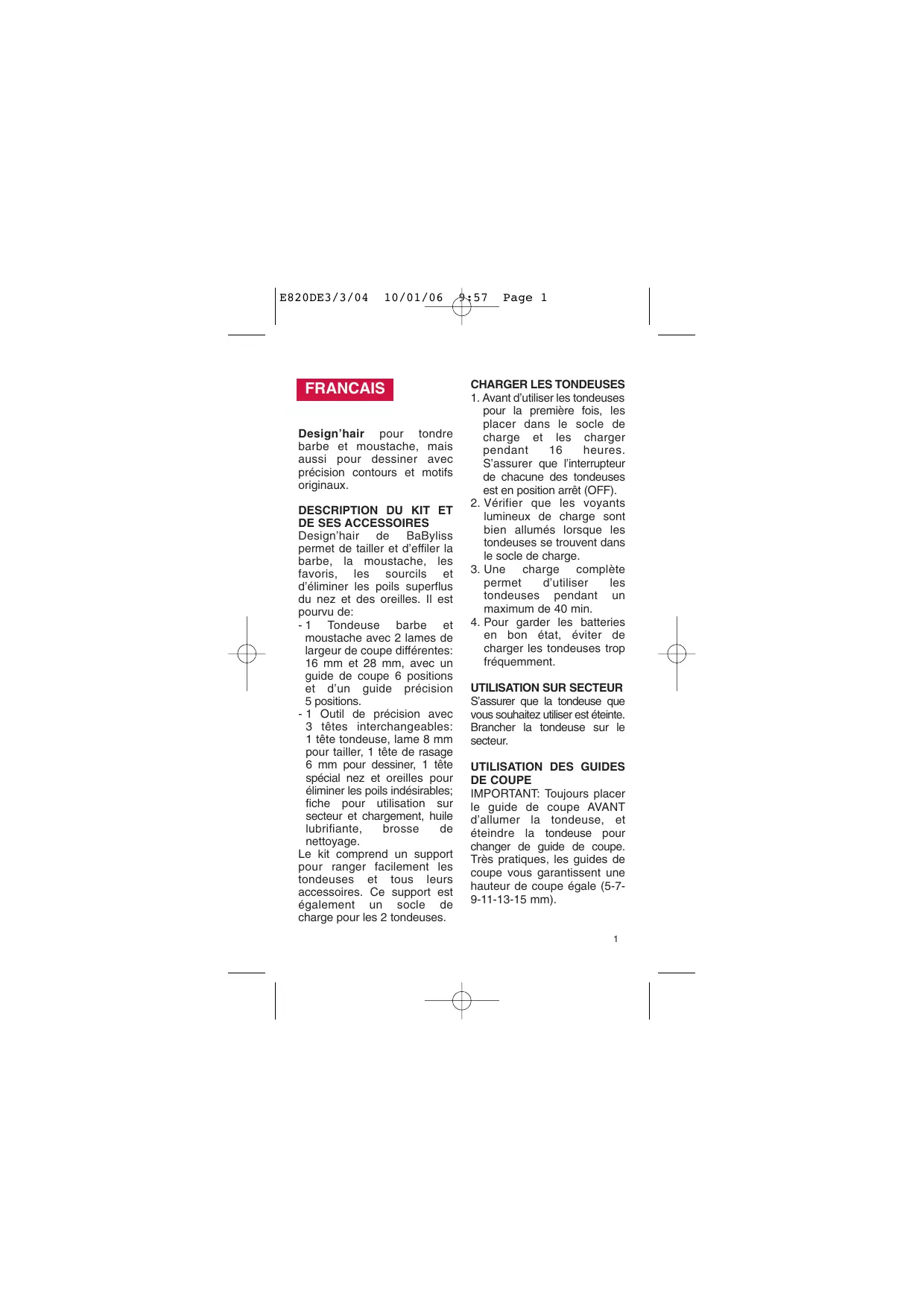 E820DECover 10/01/06 9:56 Page 2 E820DE3/3/04 10/01/06 FRANCAIS Design’hair pour tondre barbe et moustache, mais aussi pour dessiner avec précision contours et motifs originaux.