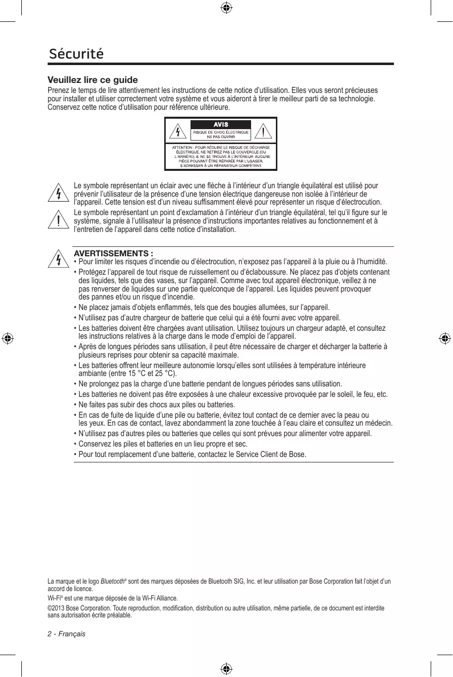 - Pour tout remplacement d’une batterie, contactez le Service Client de Bose. La marque et le logo Bluetooth® sont des marques déposées de Bluetooth SIG, Inc. et leur utilisation par Bose Corporation fait l’objet d’un accord de licence. Wi-Fi® est une marque déposée de la Wi-Fi Alliance. ©2013 Bose Corporation. Toute reproduction, modification, distribution ou autre utilisation, même partielle, de ce document est interdite sans autorisation écrite préalable.
