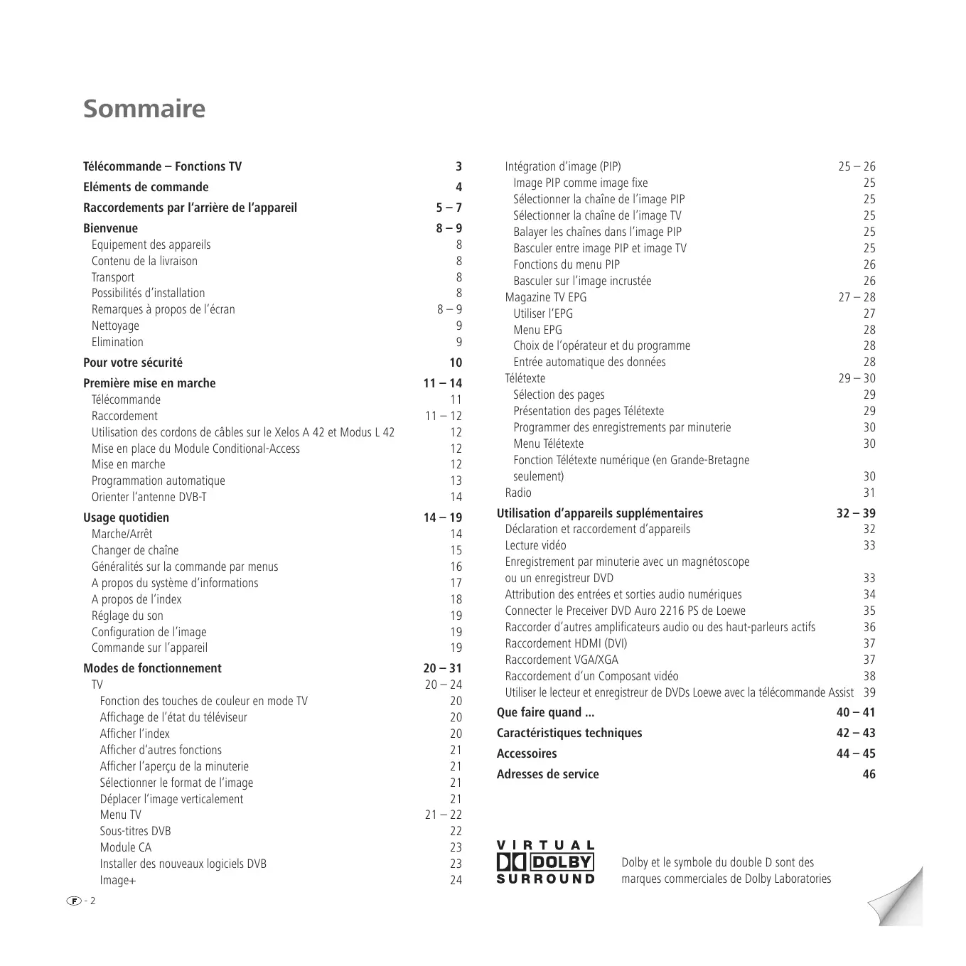 Utilisation d’appareils supplémentaires 32 – 39 Déclaration et raccordement d’appareils 32 Lecture vidéo 33 Enregistrement par minuterie avec un magnétoscope ou un enregistreur DVD 33 Attribution des entrées et sorties audio numériques 34 Connecter le Preceiver DVD Auro 2216 PS de Loewe 35 Raccorder d’autres amplificateurs audio ou des haut-parleurs actifs 36 Raccordement HDMI (DVI) 37 Raccordement VGA/XGA 37 Raccordement d‘un Composant vidéo 38 Utiliser le lecteur et enregistreur de DVDs Loewe avec la télécommande Assist 39 Que faire quand ...